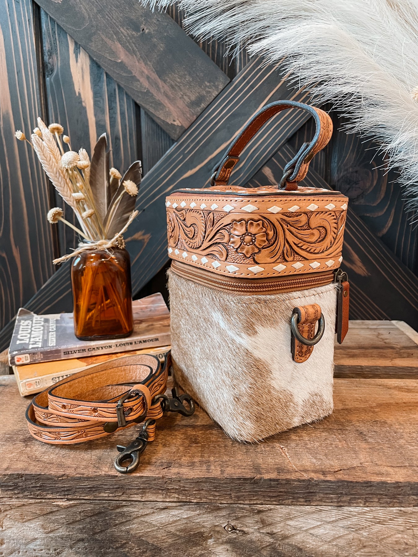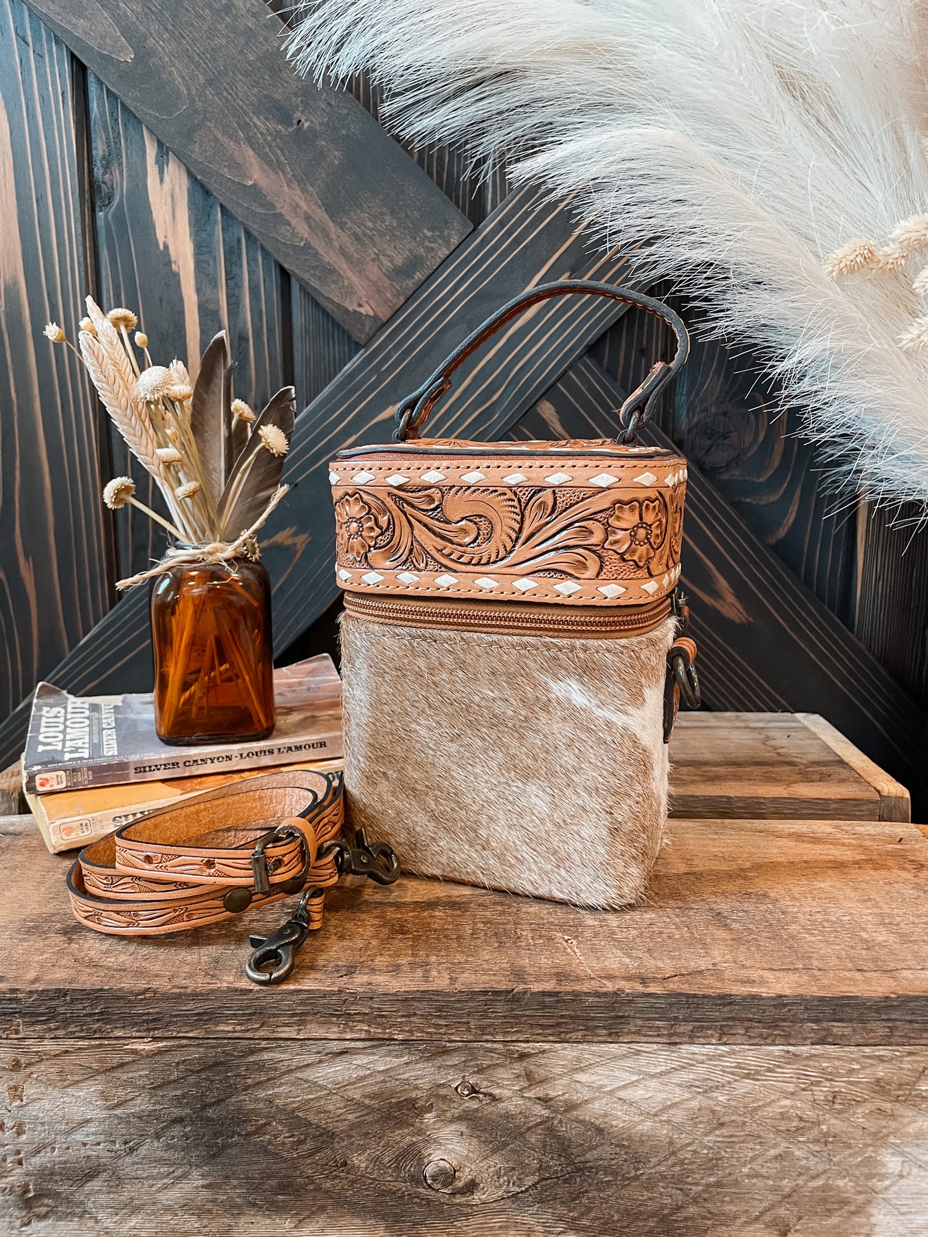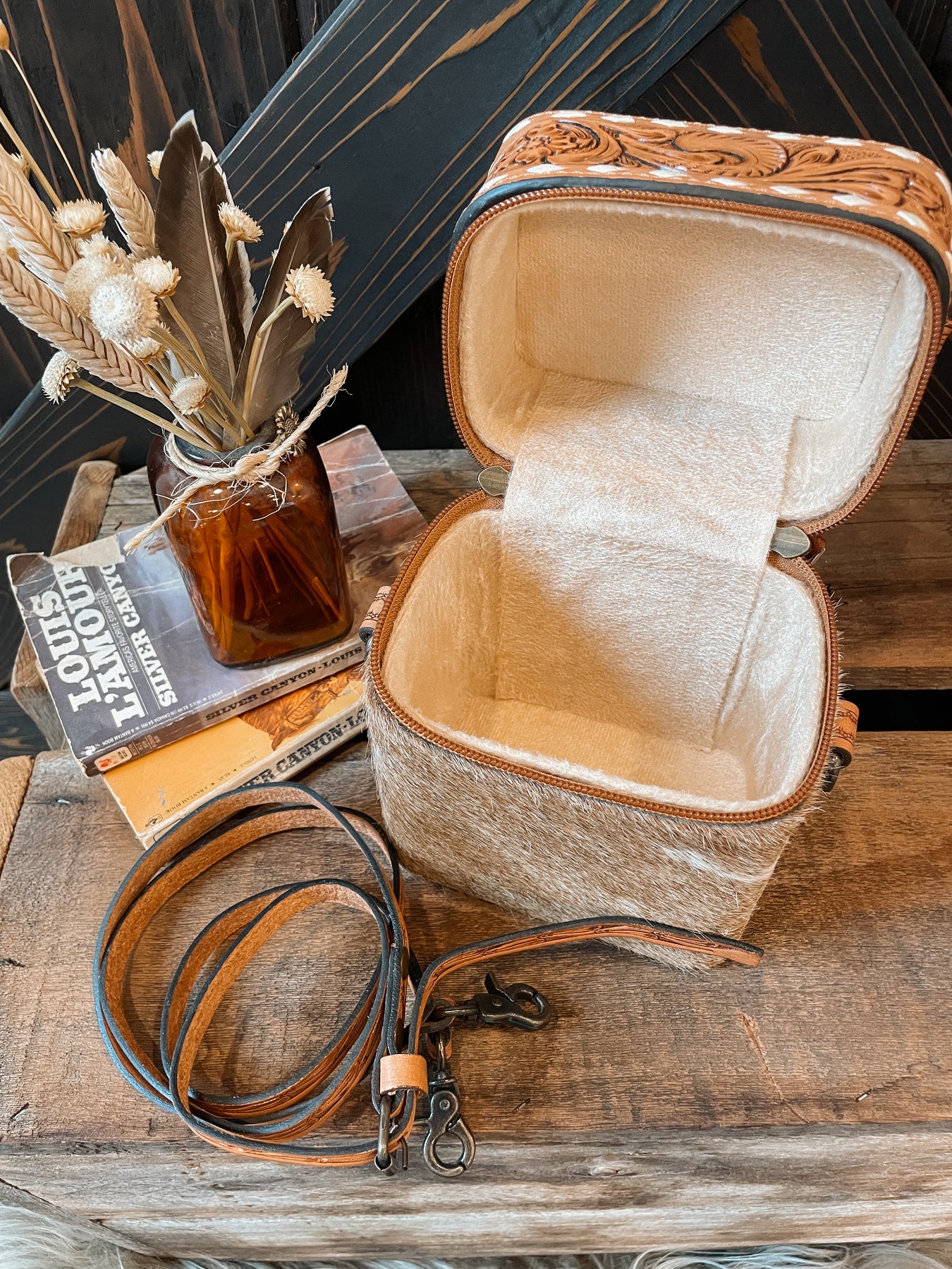 A unique purse style with a box style frame, tool leather and white buckstitch top with zipper top closure. Fully lined, structured, and leather bottom.