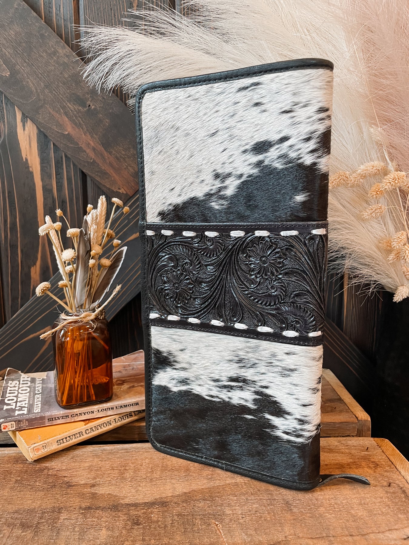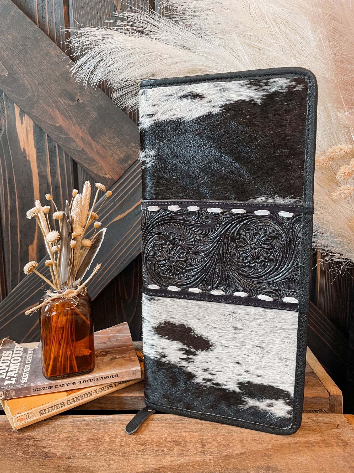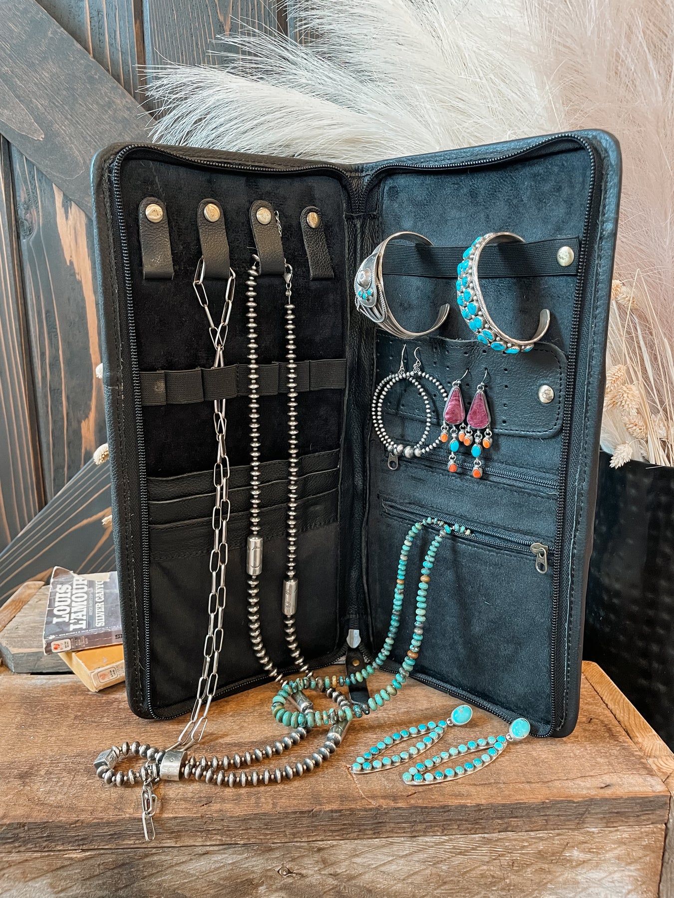 Flat cowhide organizer for jewelry or any other special items. Zipper closure and fully lined. Features: many necklace holders, earring sports, zipper pouches, and straps. Keep everythig organized and untangled.