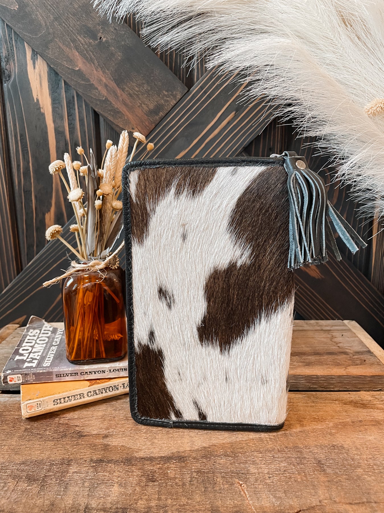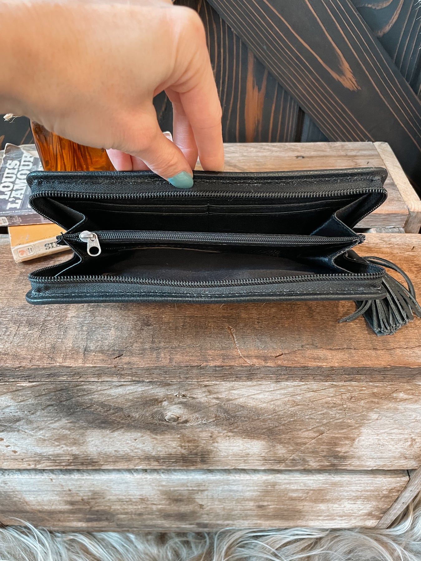 Cowhide wallet with tooled leather clutch style holding strap. Zipper closure, inside zipper coin pouch, 6 card slots, and two compartments.