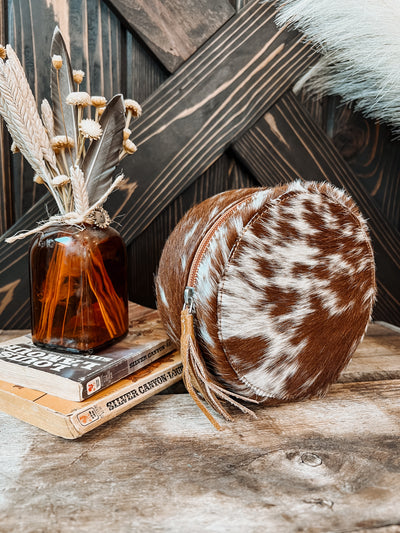 Cowhide travel case with hair on hide outter and zipper closure. Fully velvet lined with inner and removable tray.