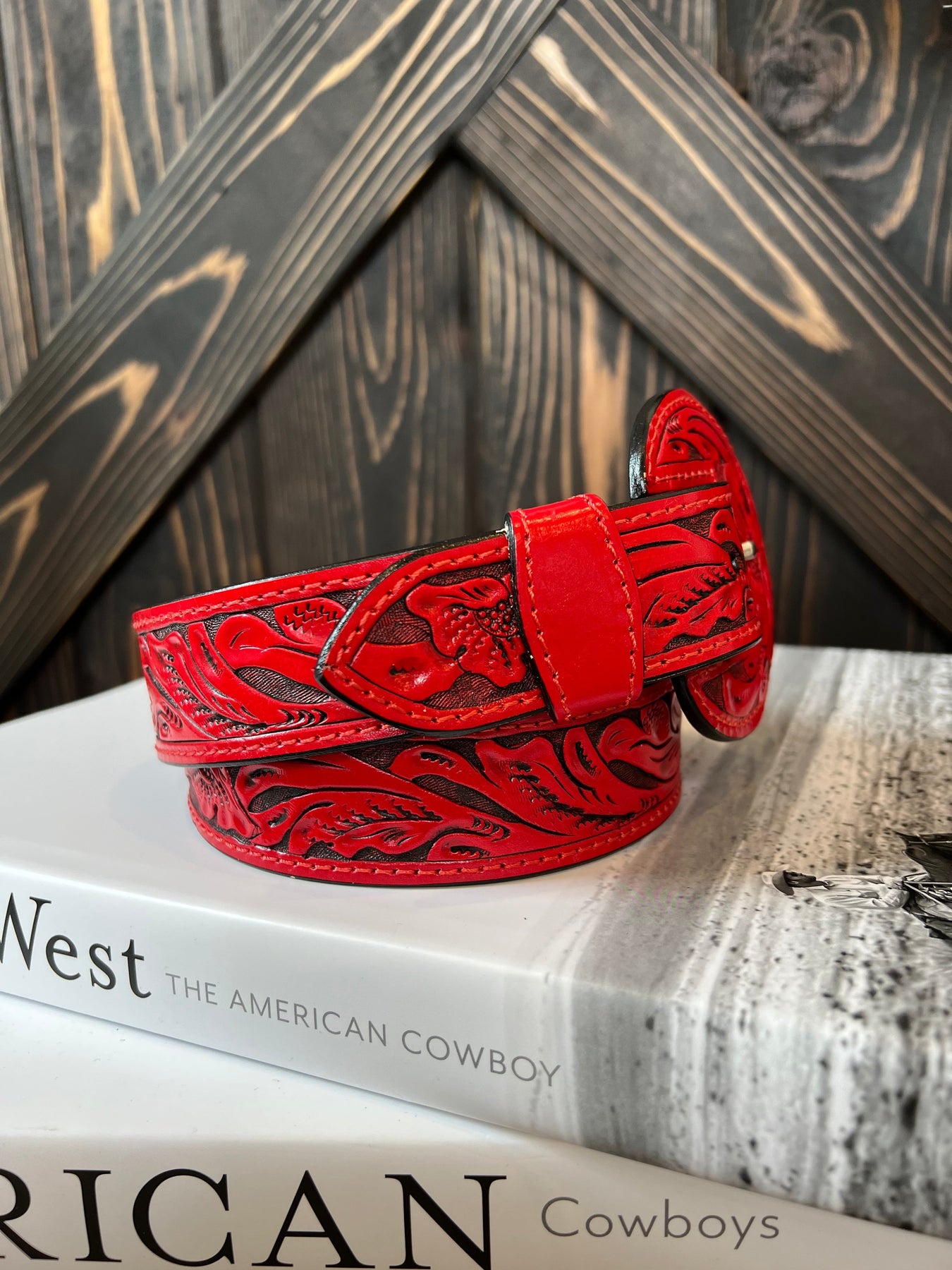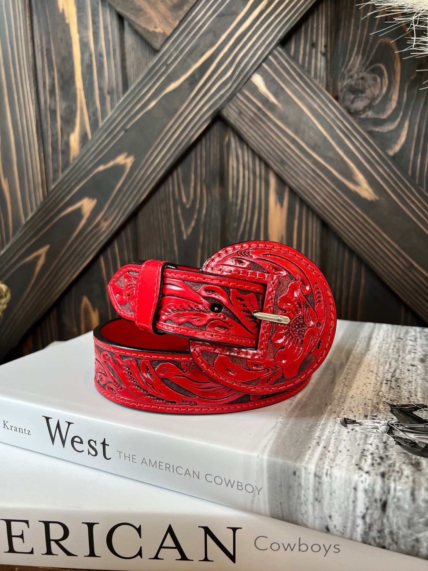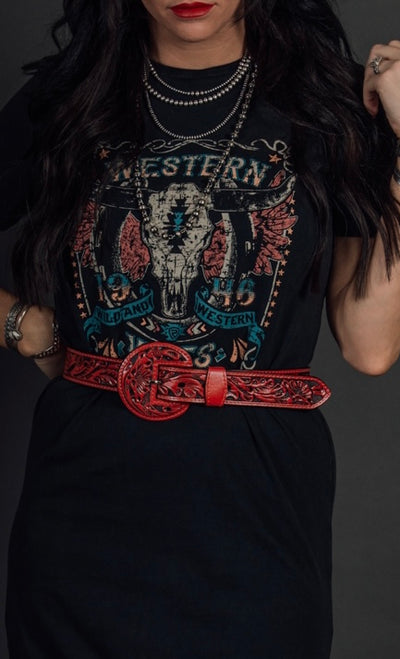 A full tooled leather belt with matching leather buckle. A statement to any outfit.
