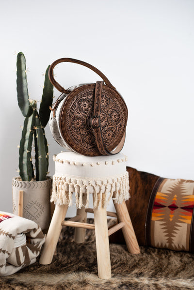 The cutest canteen style purse ever! Front tooled leather patch with a whip stitch edge detail. Comes with a shoulder handle as well as a slim tooled leather crossbody strap. Zipper top closure, is fully lined, comes with an inner side pocket, and an inner zipper privacy pocket. Cowhide edges will vary.
