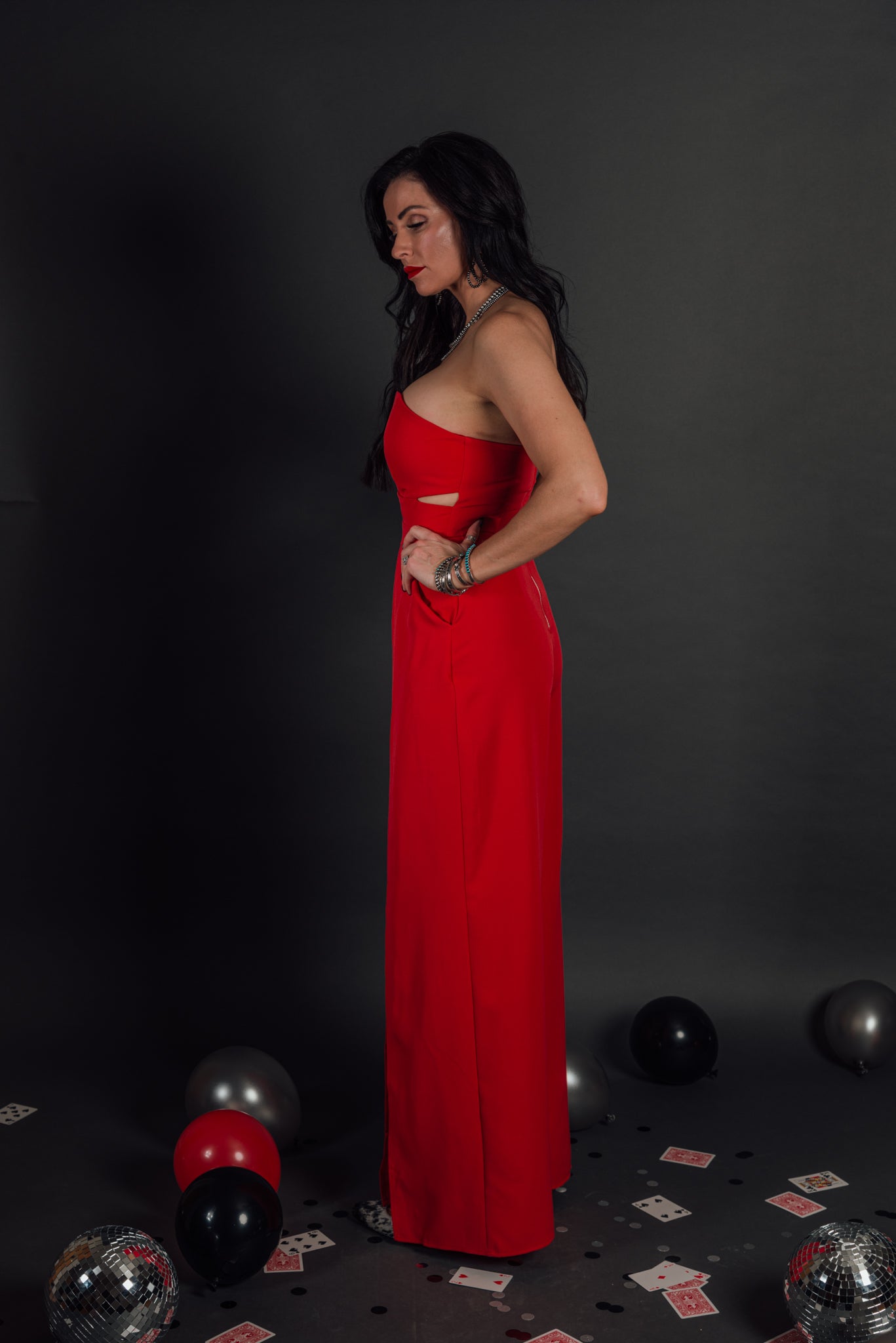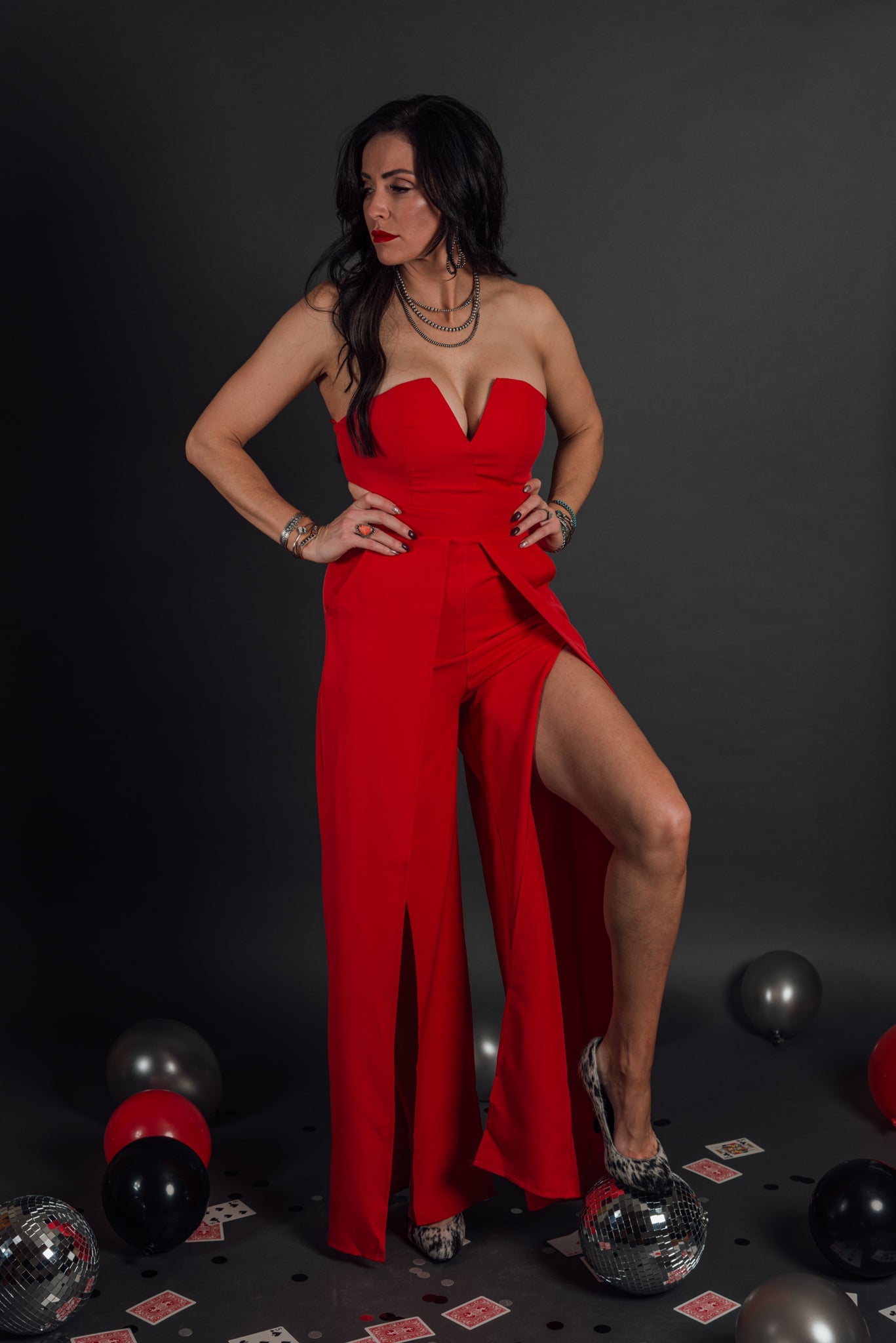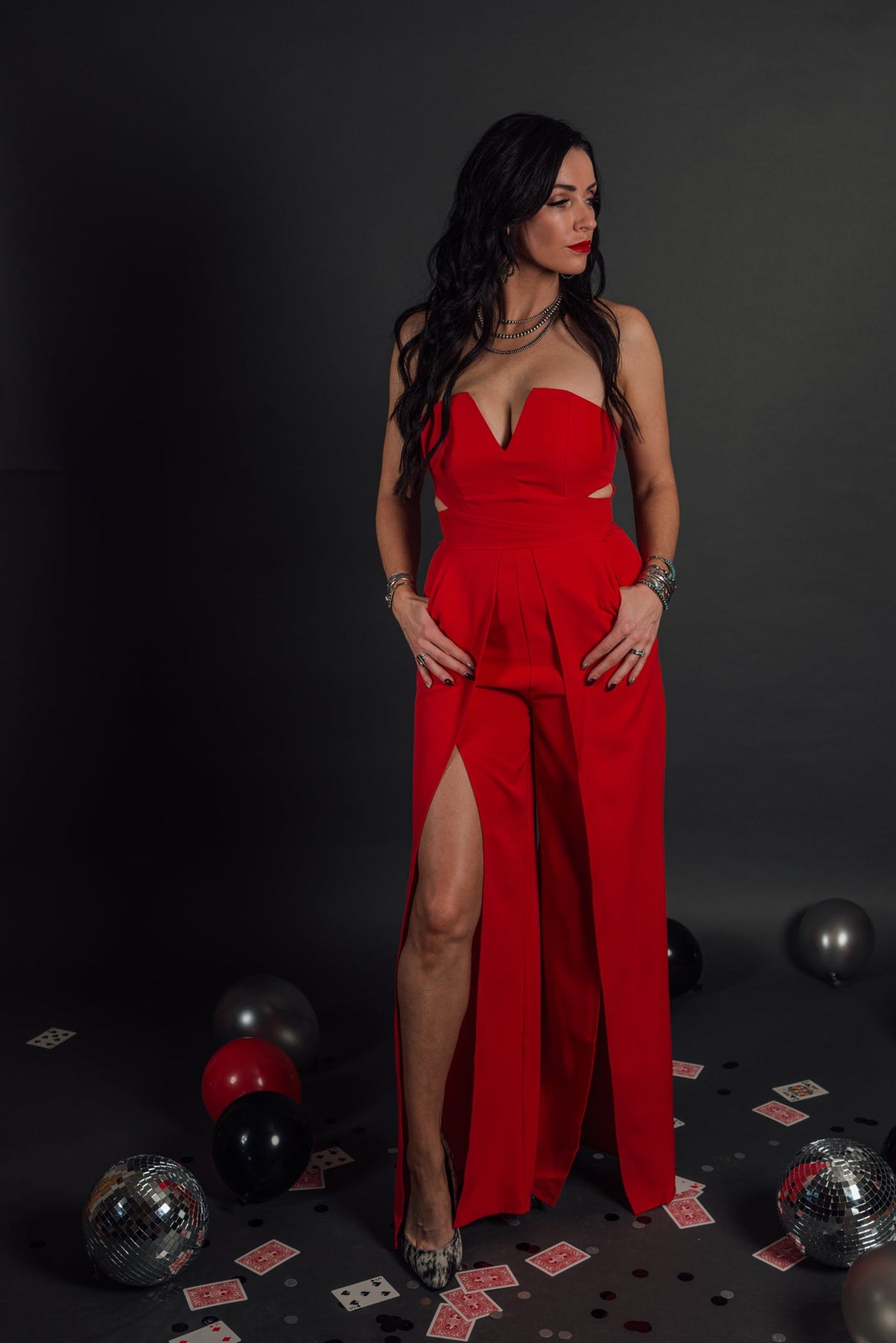Open slit bustier jumpsuit. Zipper back closure and strapless top. Has great structure and a little stretch.