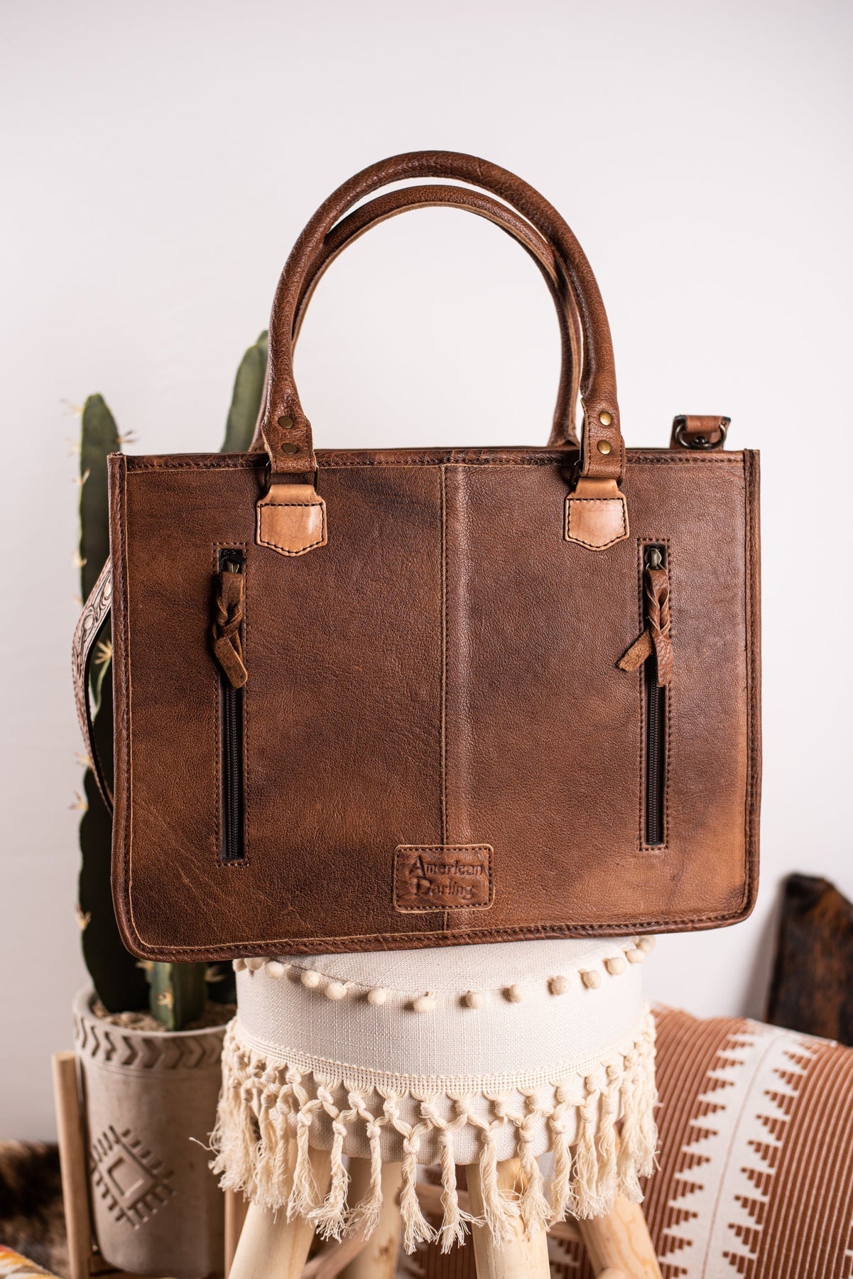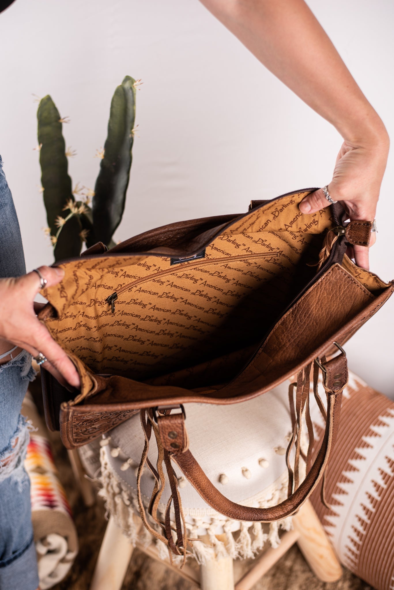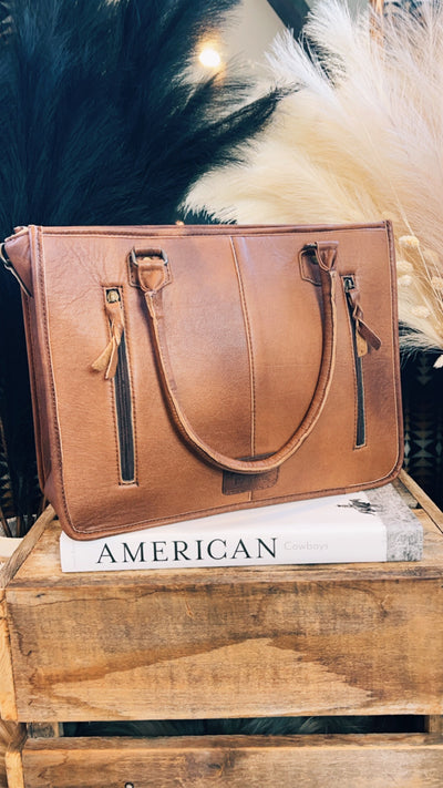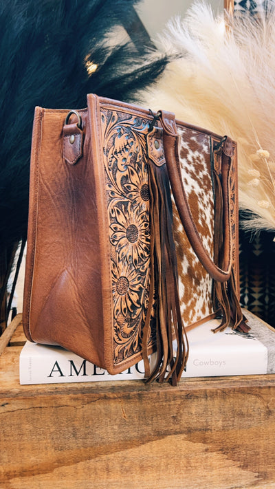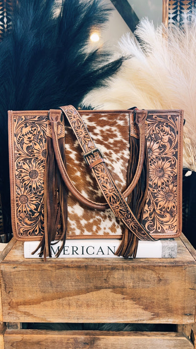 The perfect tote with the right amount of leather and cowhide mix. 100% genuine leather tote with front brown and white cowhide panel with front fringe detail. Shoulder straps perfect for carrying and optional tooled leather crossbody strap included. Top zipper closure with two generous inner side pockets and a privacy side zipper pocket. Fully lined.