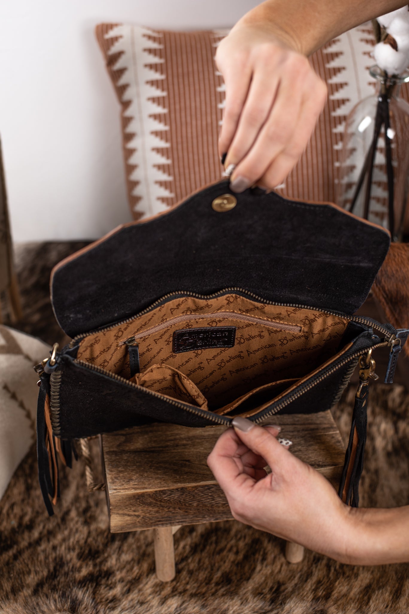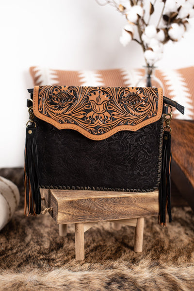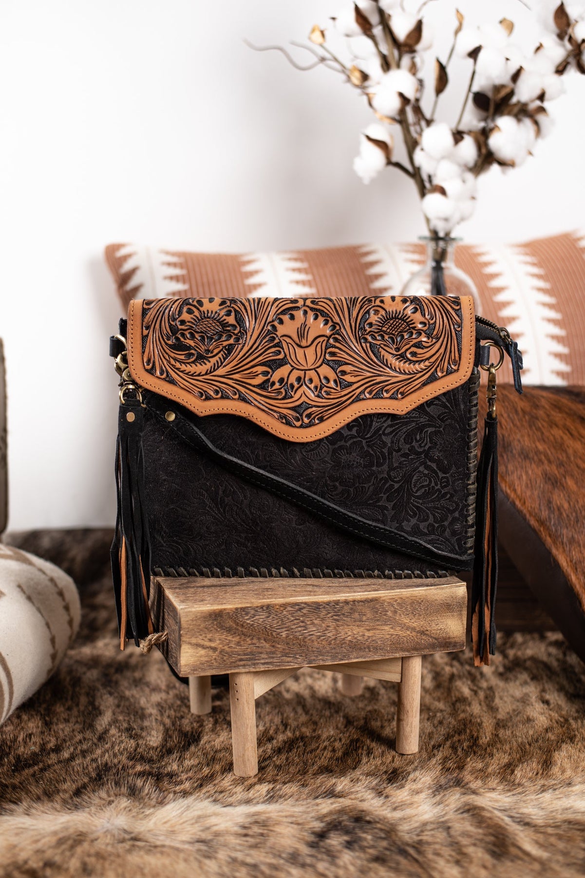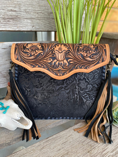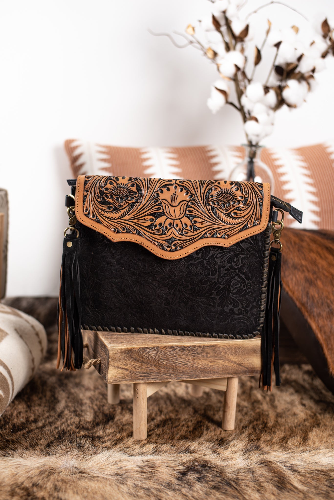 Hello gorgeous! Cute tooled leather crossbody purse with whip stitch edging detail. Fold over tooled leather top with magnetic closure. Fully lined and has a zipper top closure. Comes with an optional crossbody strap that is adjustable in length.