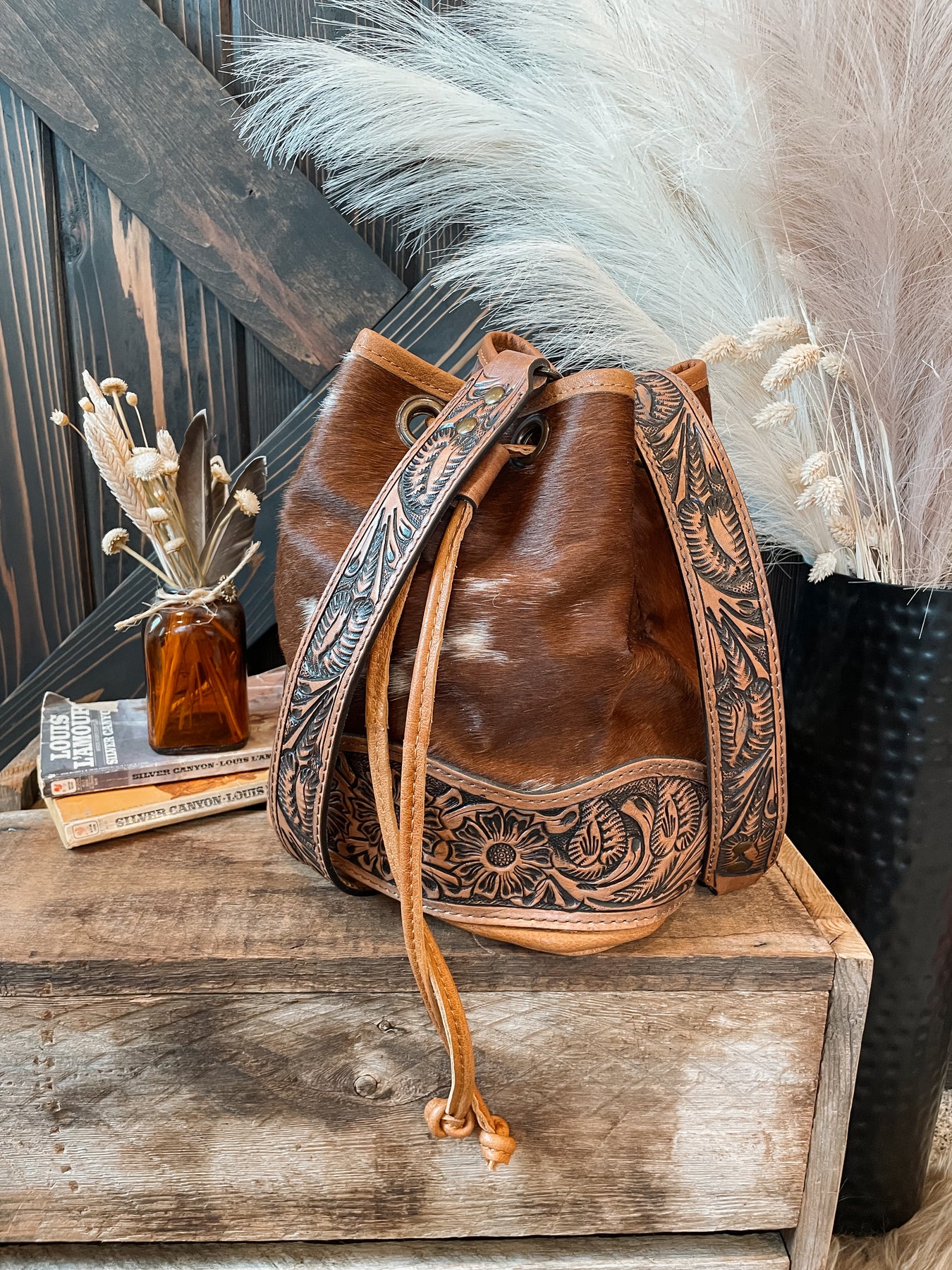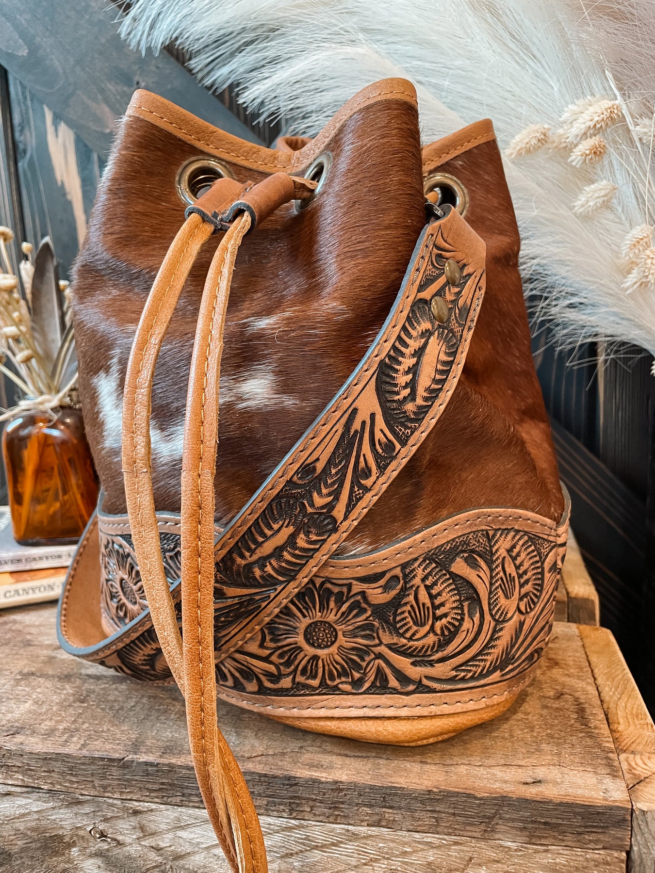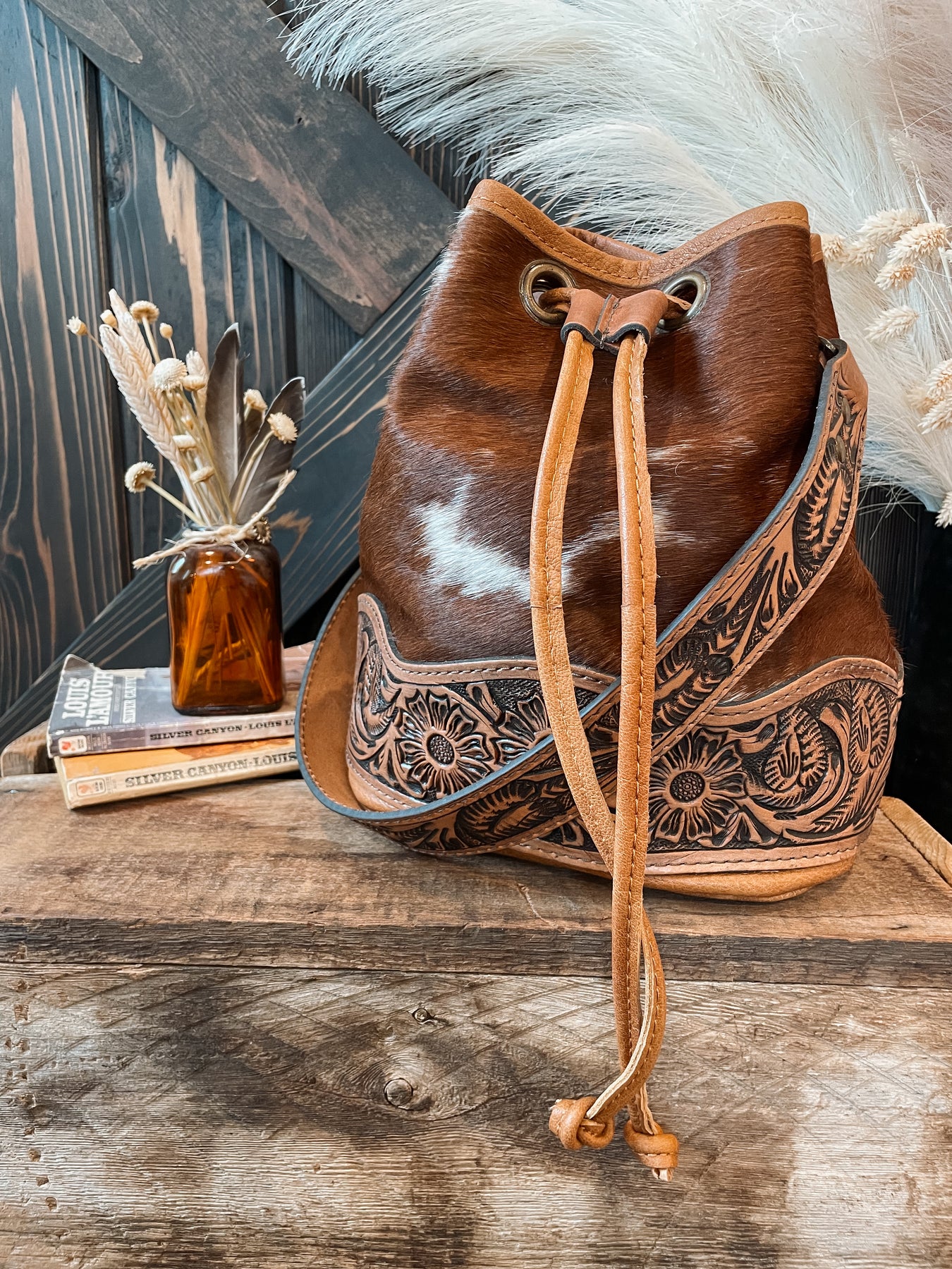 Hello beautiful. A gorgeous cowhide drawstring style purse. Top has drawstring closure, fully lined, inner side pocket, and inner zipper privacy pocket. Bottom has a tooled leather patch that wraps around with buck stitch edging. Comes with tooled leather crossbody strap.