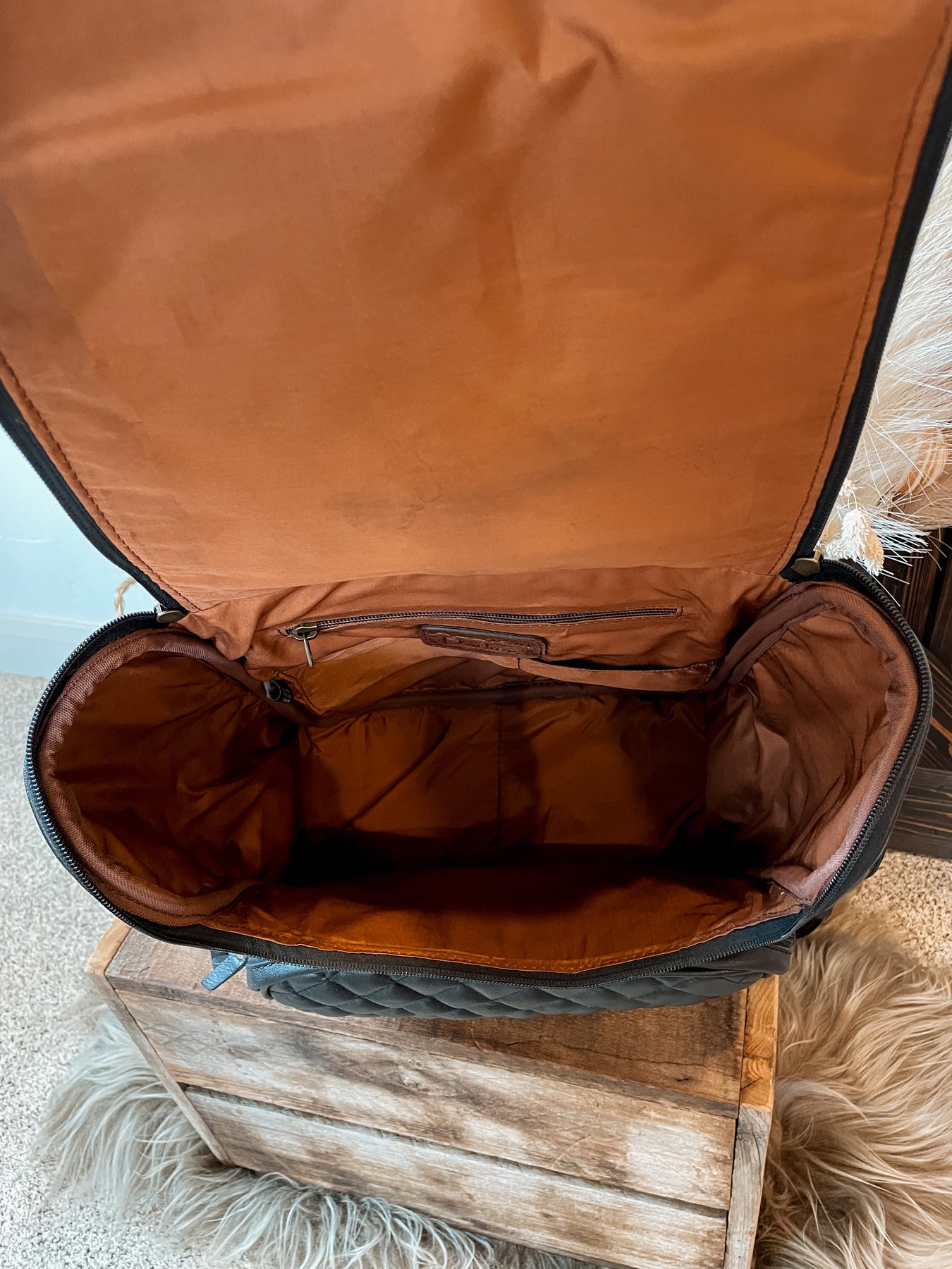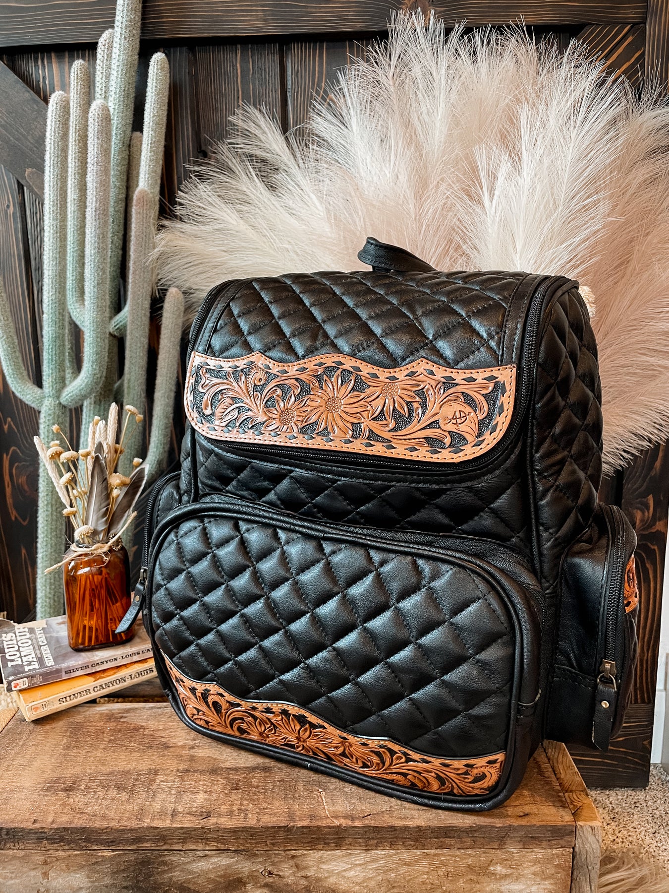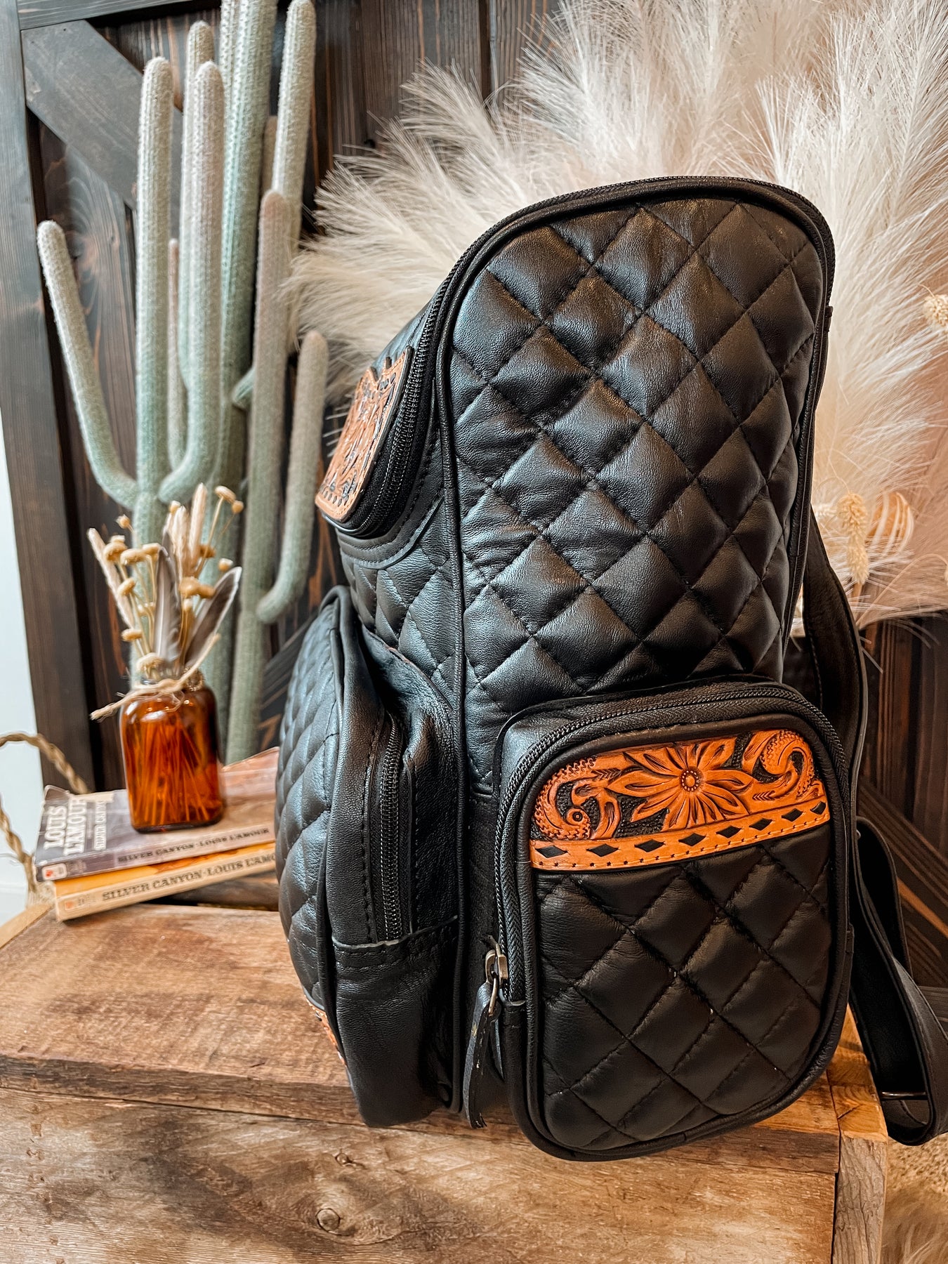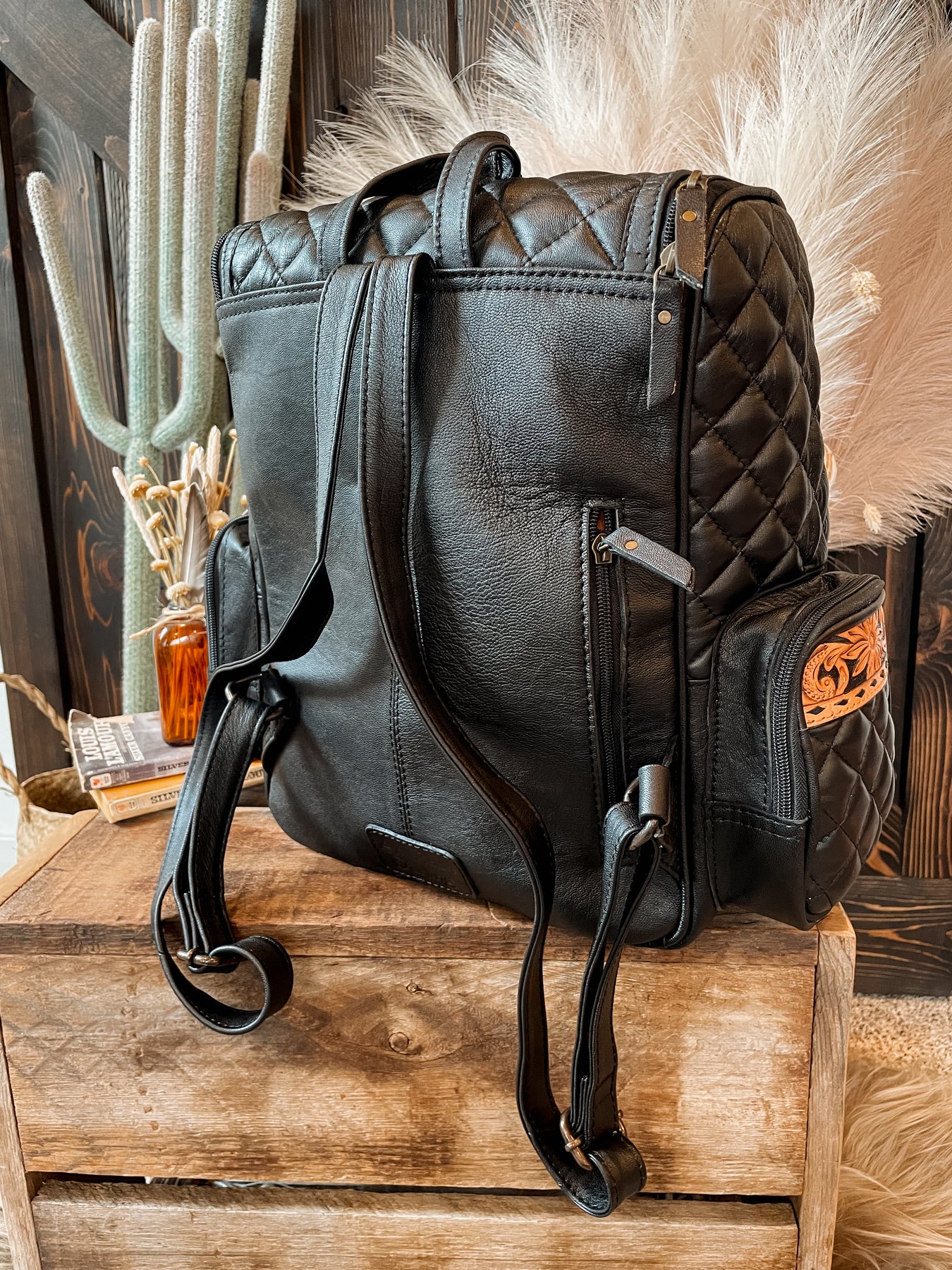 Leather backpack with a back leather panel, adjustable straps with tooled leather patch details, black buck stitch, and fully lined. The inside has a two elastic side bottle holders, electronic slide pocket, and is fully lined. Front has a big front pocket with a smaller front pocket as well as two side zipper pockets. Zipper top closure.