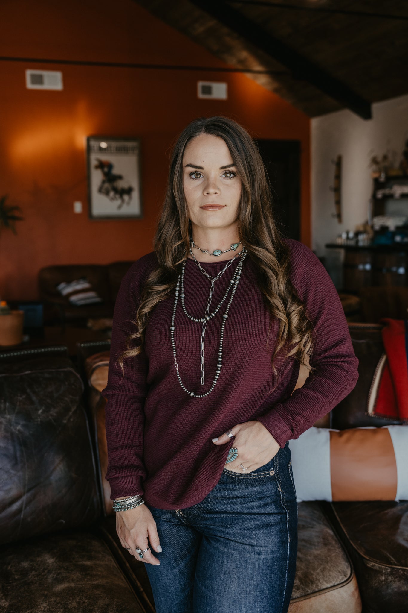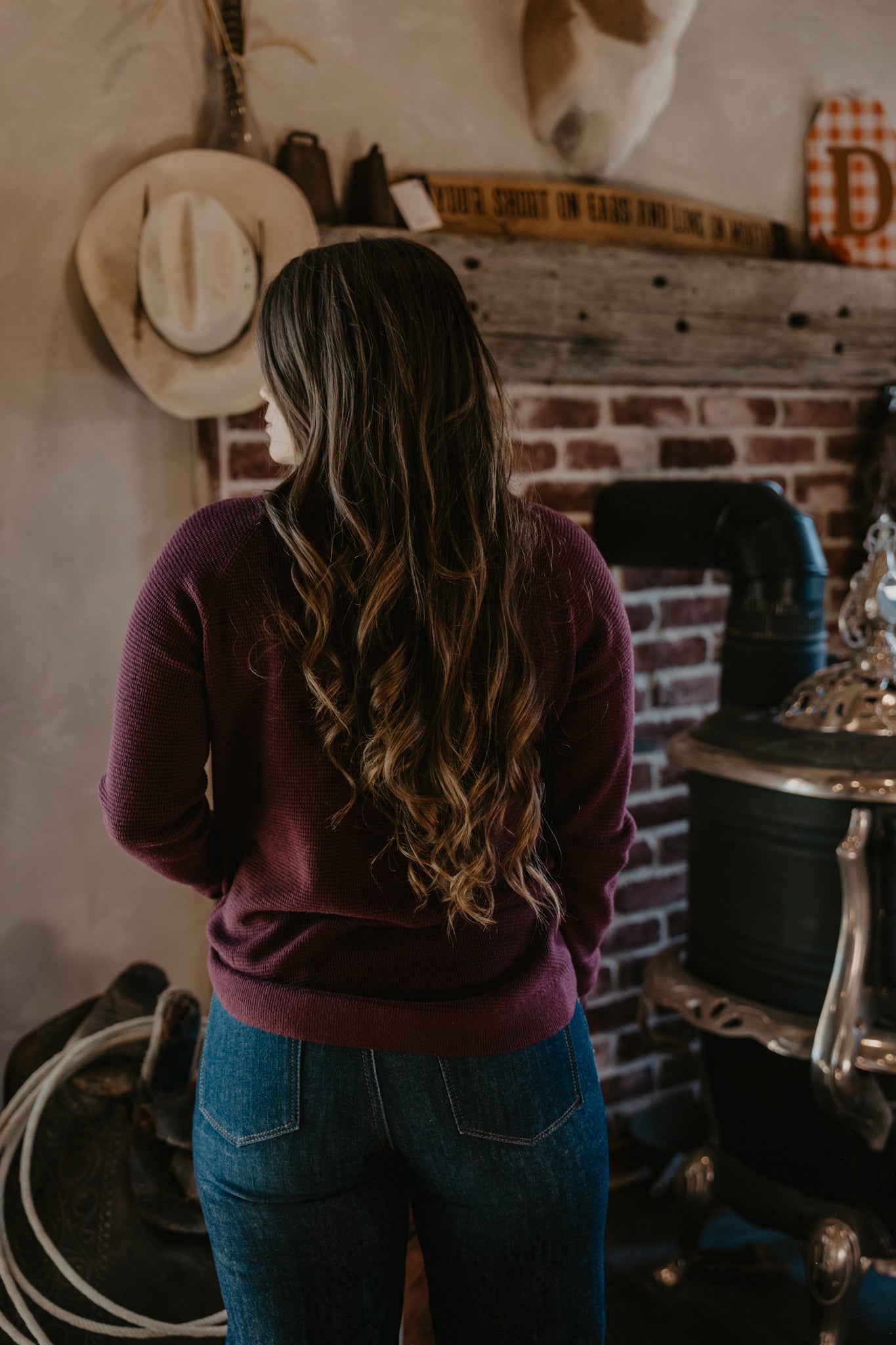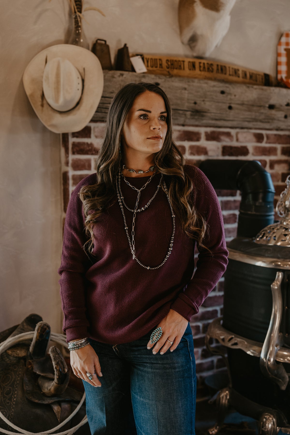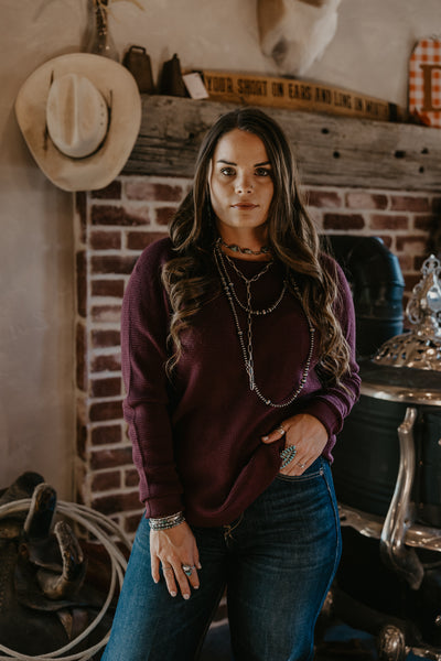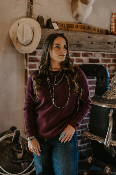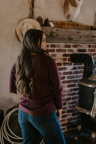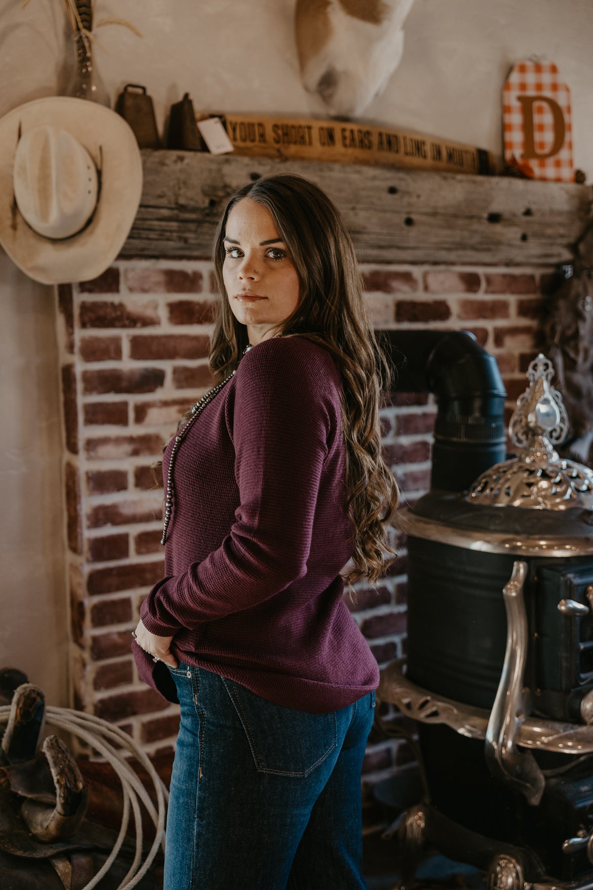 One of our fans favorite sweaters each year! Lightweight, henley style, with scalloped bottom. Runs true to size.