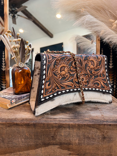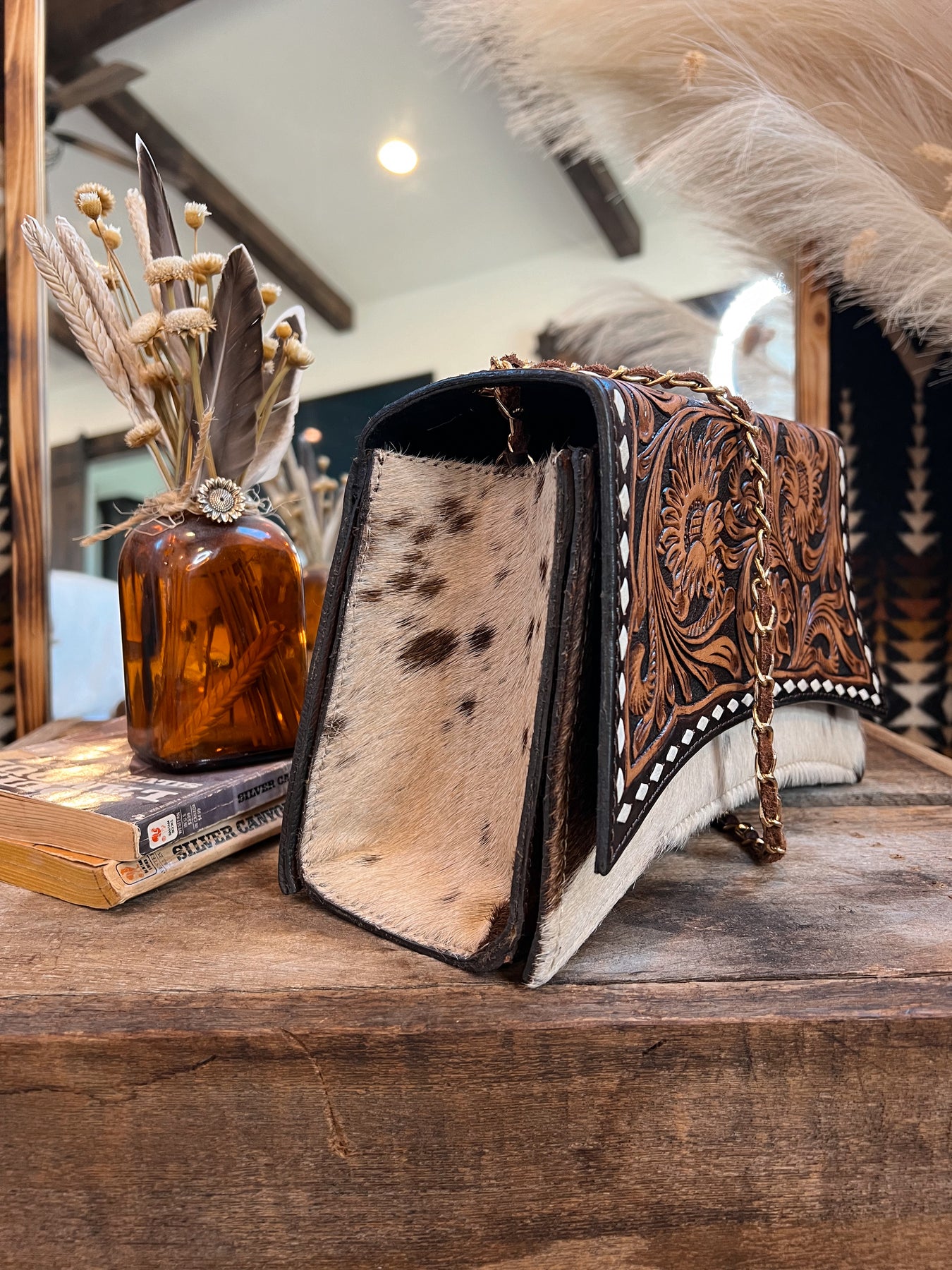Western glam meets uptown chic...with a bit of punchy in there. This gorgeous handbag is a must for all you stylish western babes. Leather bag, fold over top closure with double magnetic closure. One main large compartment, inner slide compartment, and zipper closure compartment. Fully lined. Tooled leather front patch with white buckstitch.