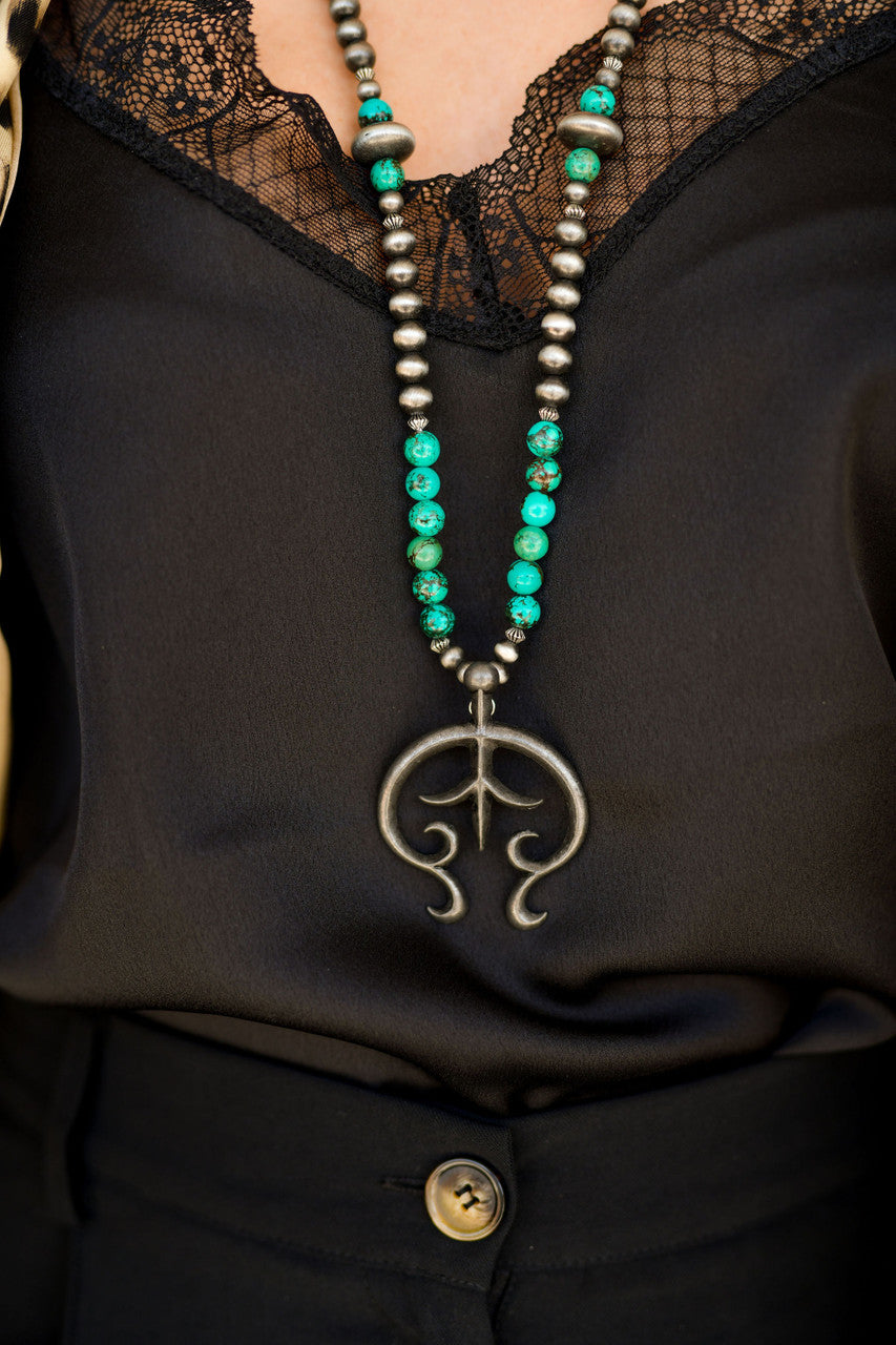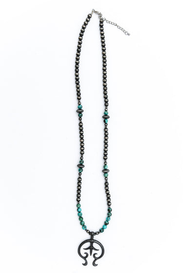 36" Faux Navajo Pearl Necklace with Naja Charm and Green Turquoise Accents