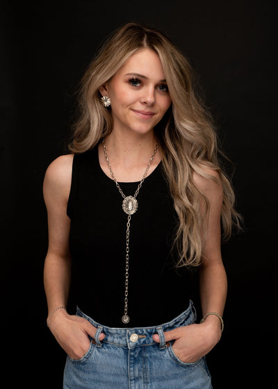 20" with 6" Tail Silver Chain Lariat Necklace with Concho Accents