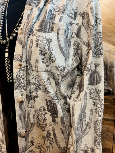This top is such a great layering piece with western graphics throughout. Lightweight button down with two front chest pockets.