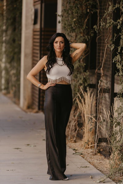Make them stop and stare! A long length faux leather trouser pant that is slimming and ultra comfortable. High waisted, pin tuck on front, faux leather, and has a hidden back zipper closure.