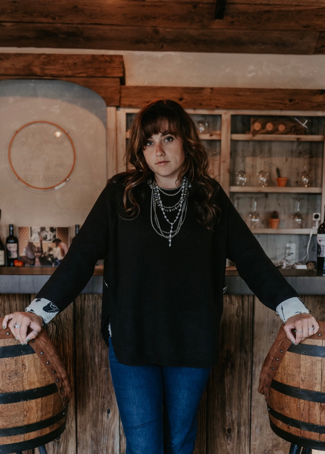 Such Beth Dutton and Yellowstone vibes with the knit oversized sweater. Has a semi split side that over lays each other with a concho top detail. Runs roomy.