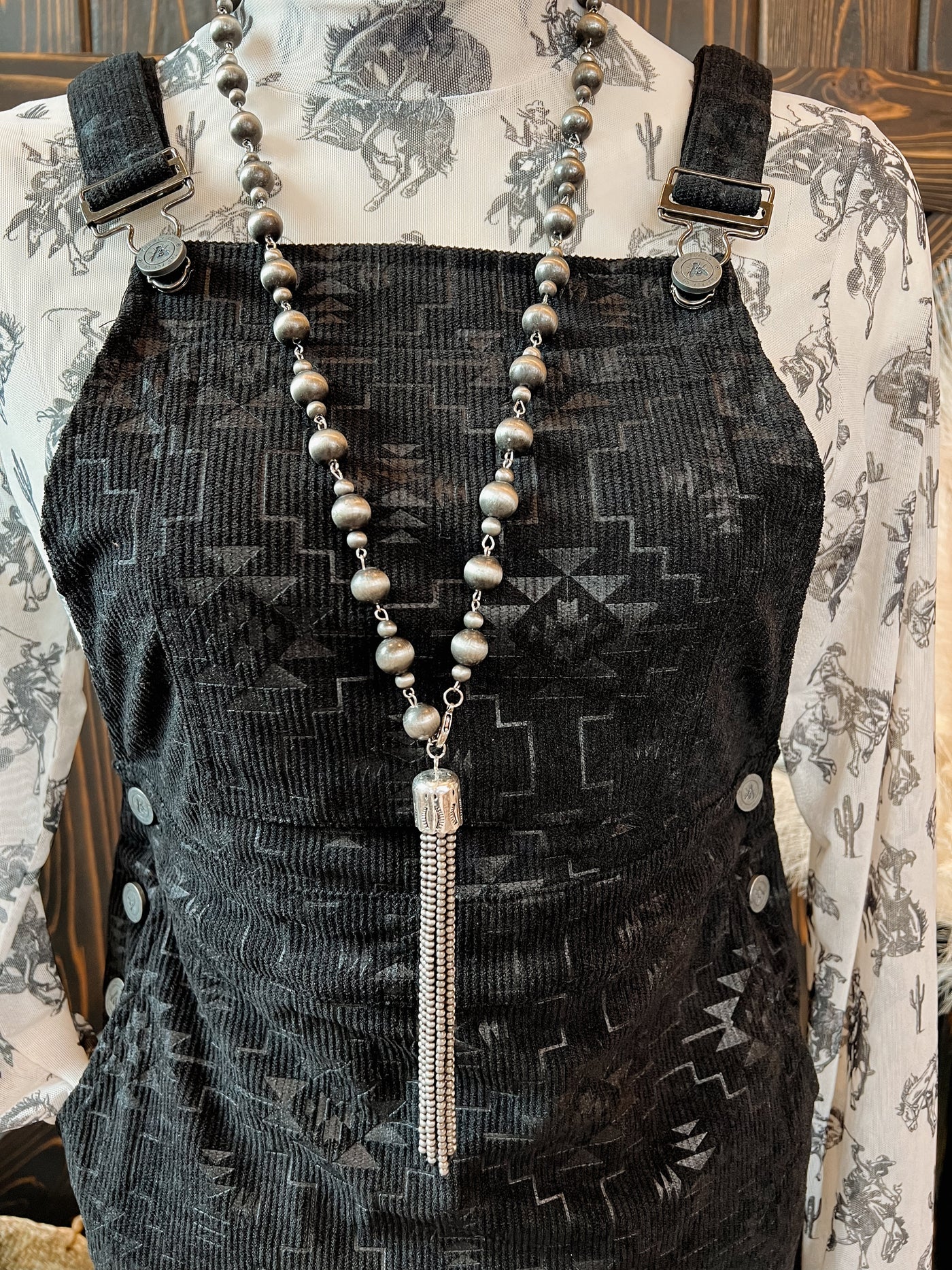 Faux Navajo pearl beaded necklace with bottom tassel.