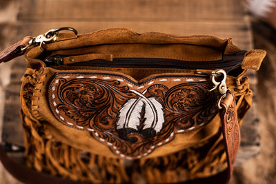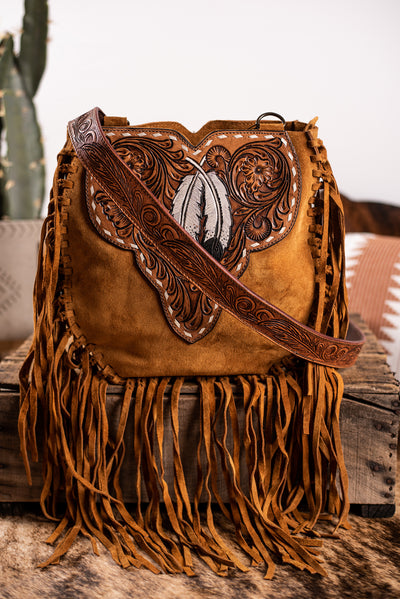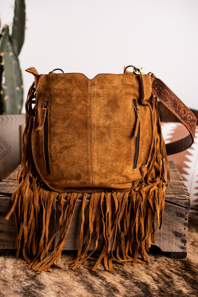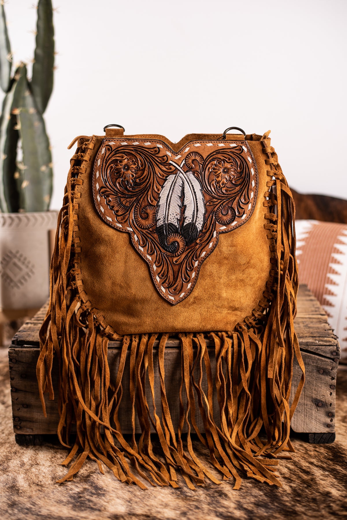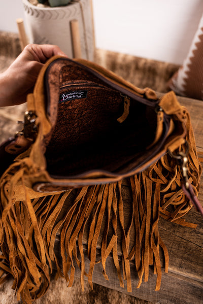 For all my boho babes who love everything fringe and dreamy! Gorgeous suede leather purse with side fringe detail. Front hand painted and tooled leather patch with white buck stitch edging. Knitted suede fringe edges. Zipper top closure, fully lined, inner zipper privacy pocket, and side pocket. Tooled leather crossbody strap.