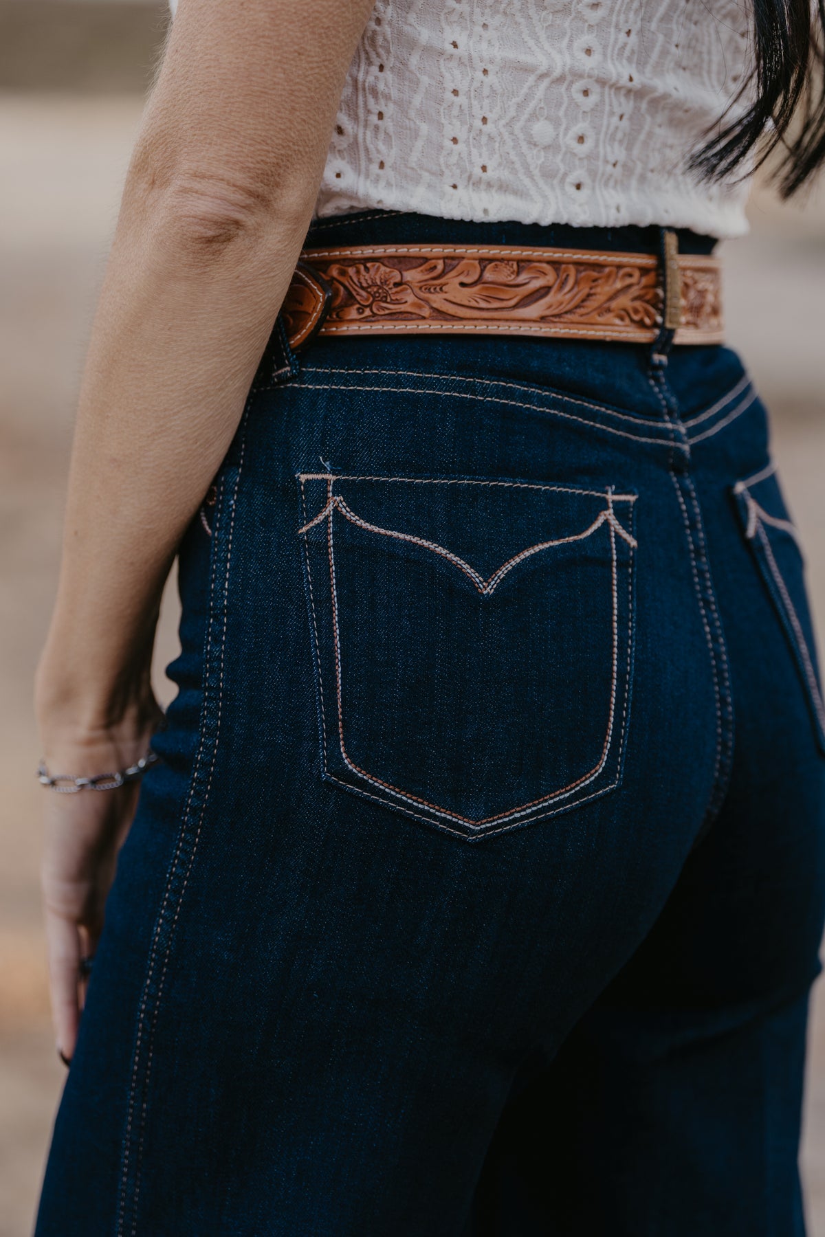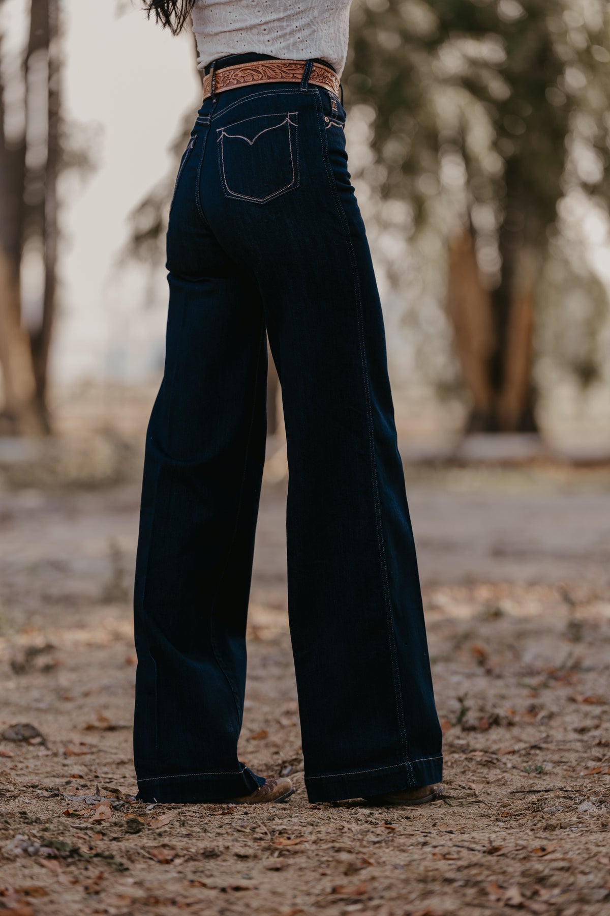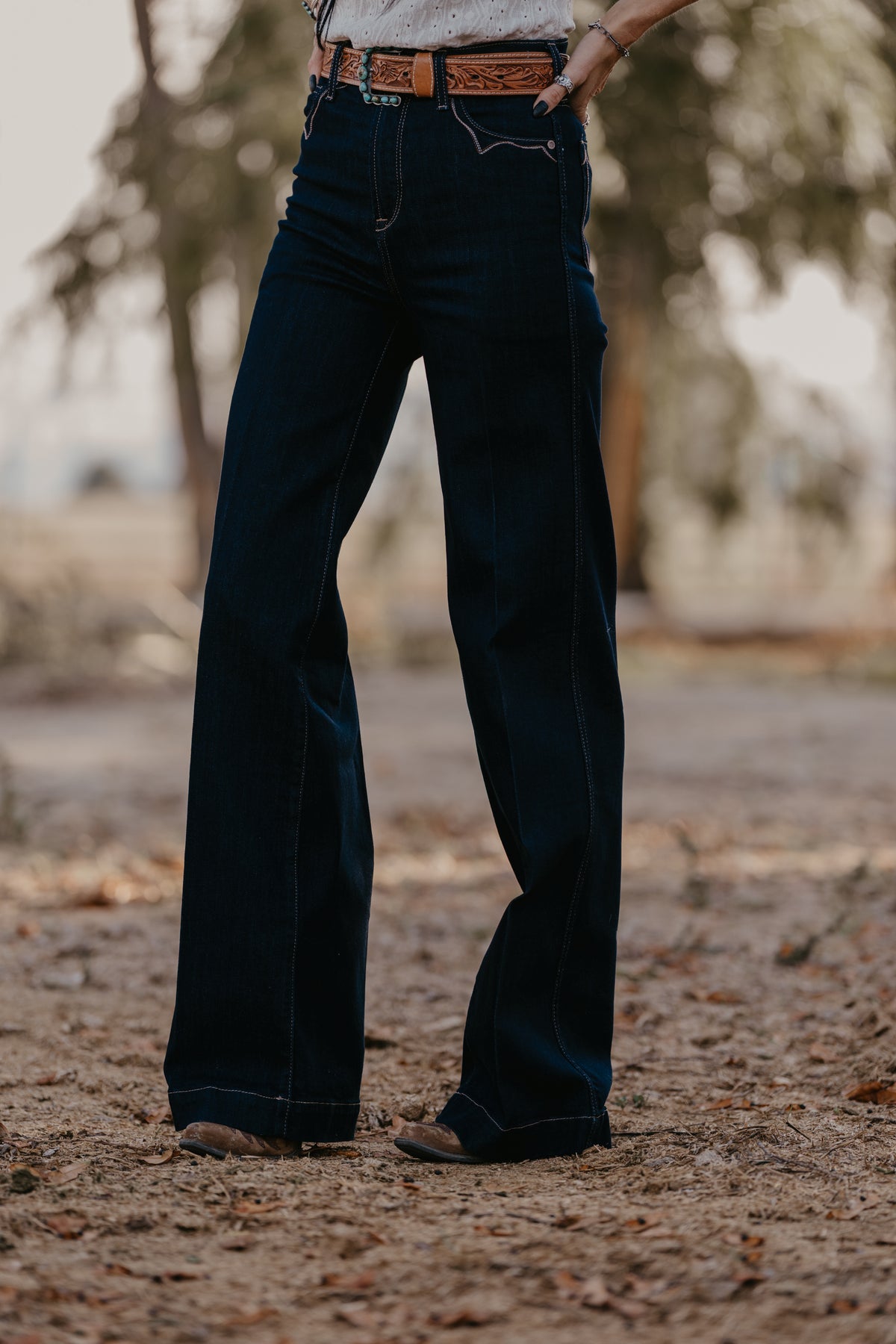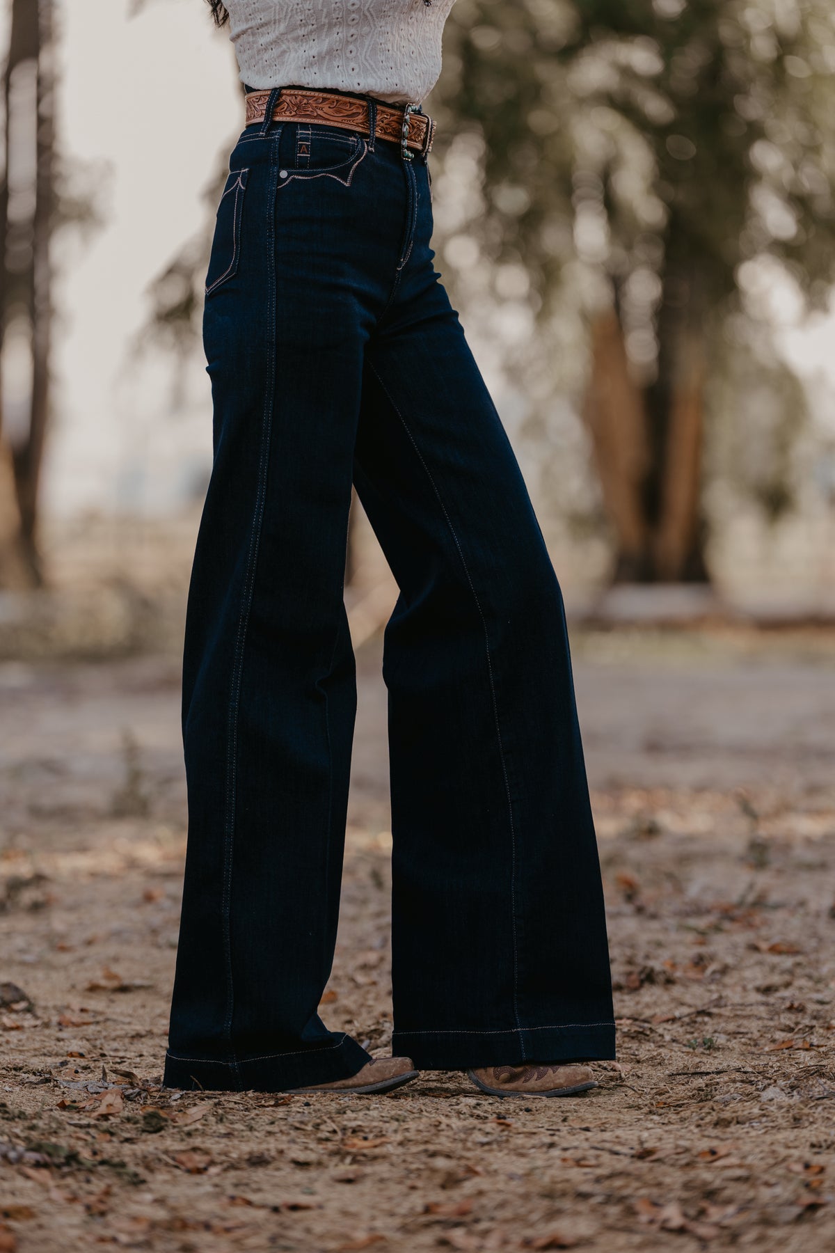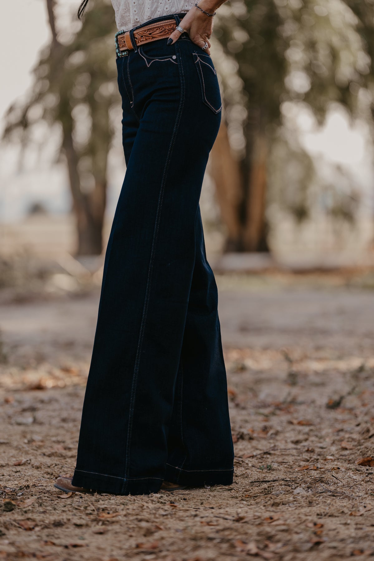 Wide legs, dark rinse, Western details—this jean checks all the trend boxes. Ultra-flattering and incredibly versatile, it shines in the arena and on the town. Delicate stitching adds to its ranch-chic vibe.