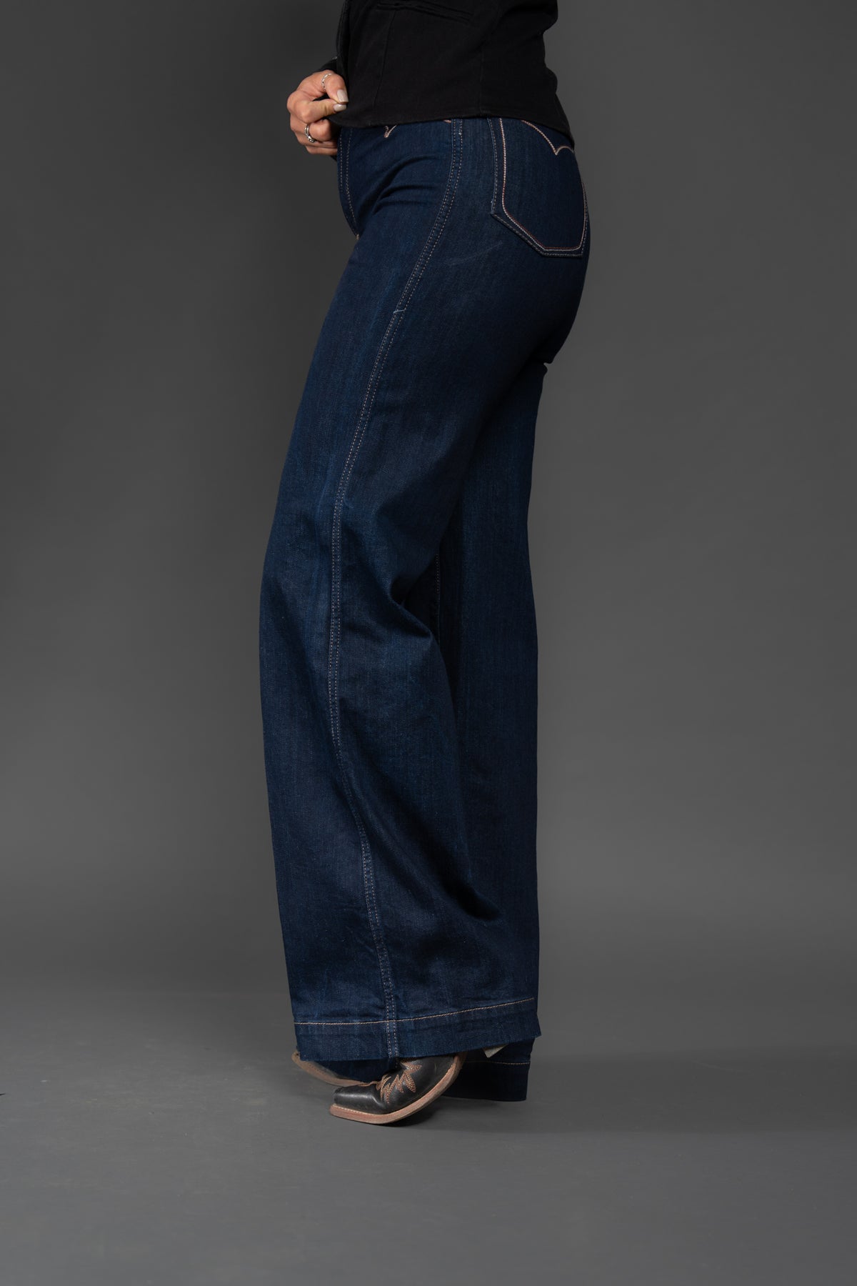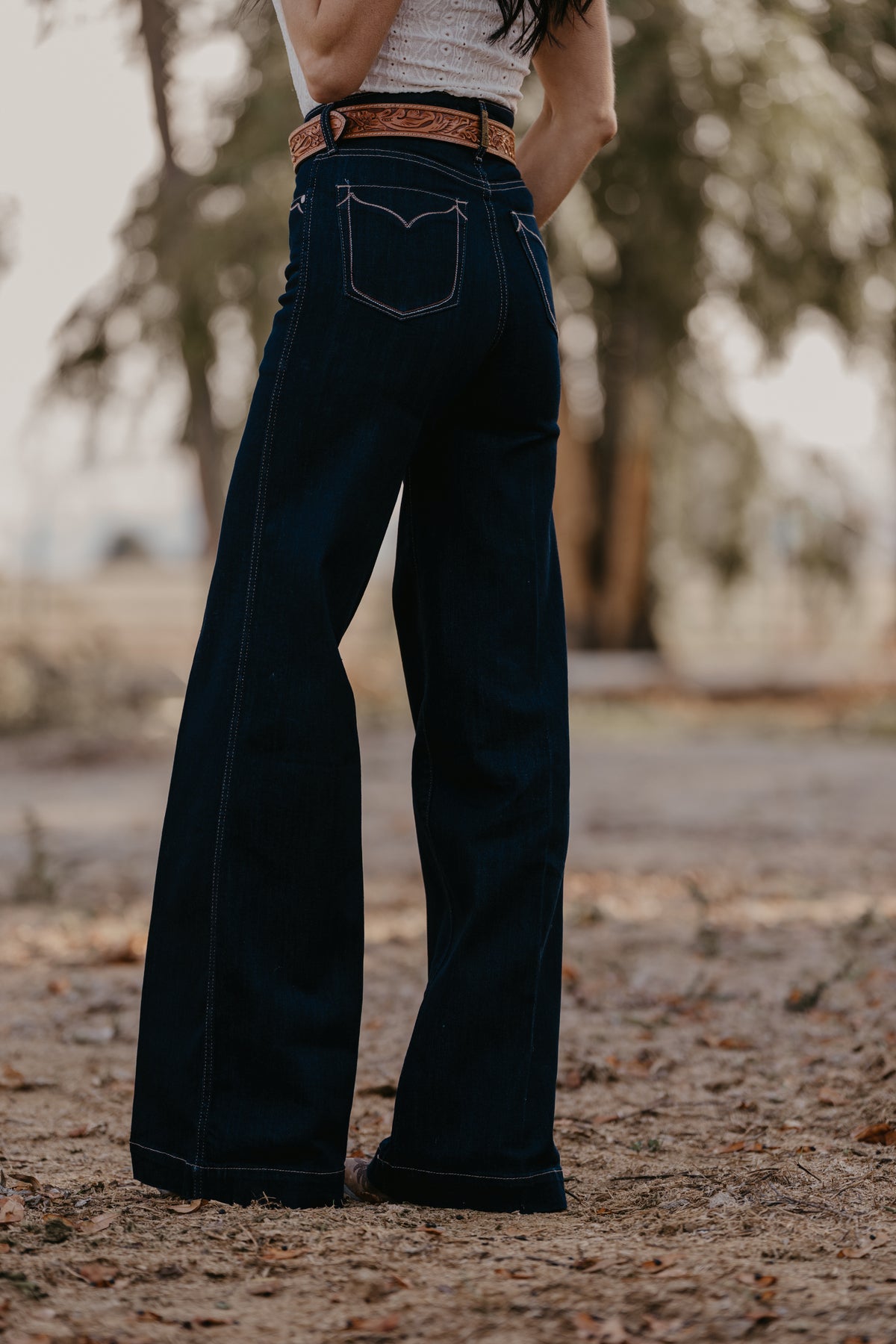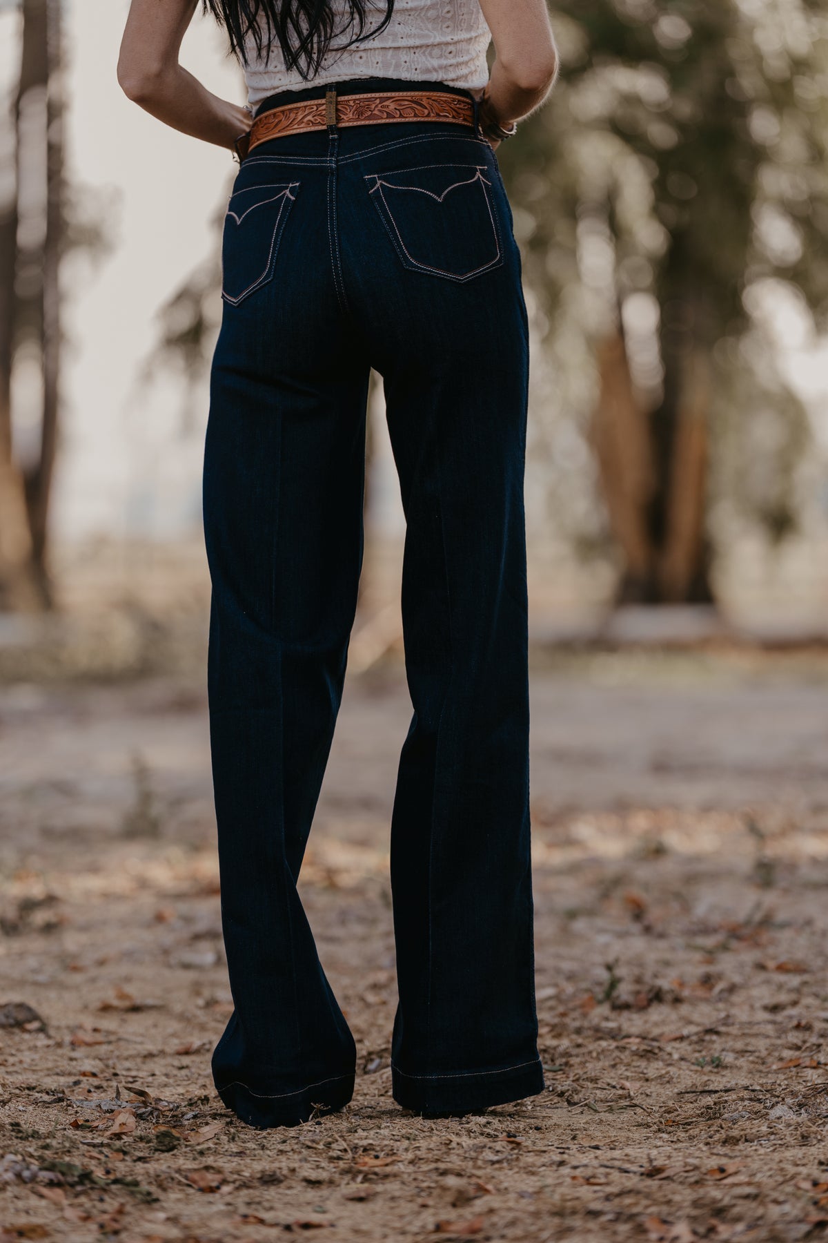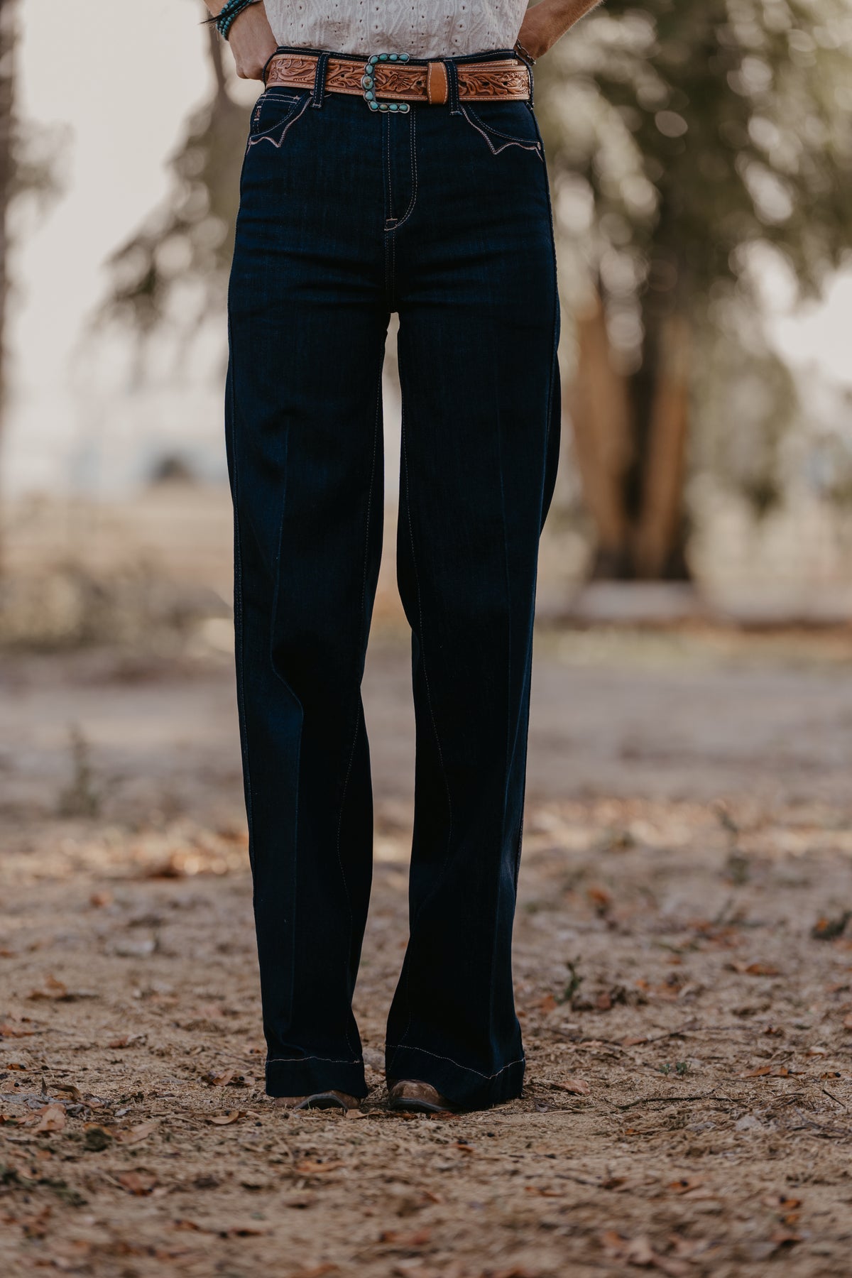 Wide legs, dark rinse, Western details—this jean checks all the trend boxes. Ultra-flattering and incredibly versatile, it shines in the arena and on the town. Delicate stitching adds to its ranch-chic vibe.