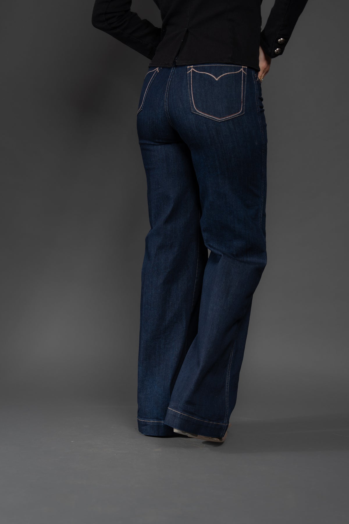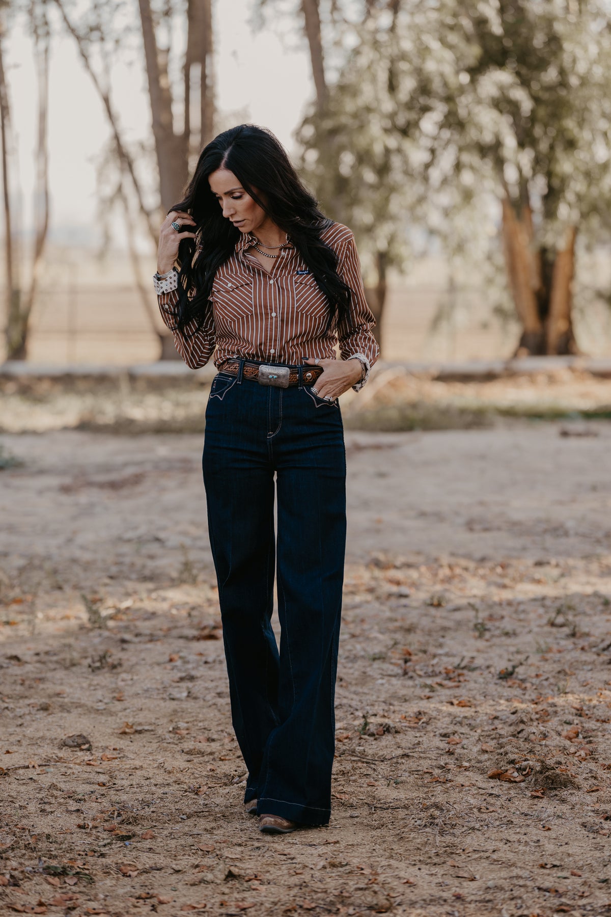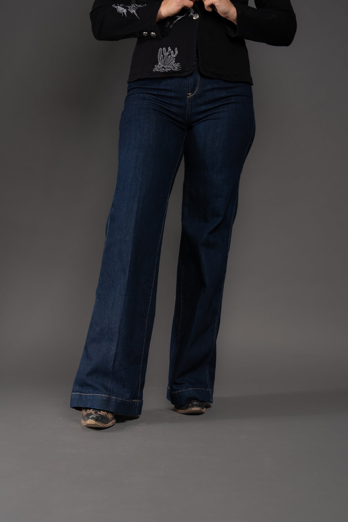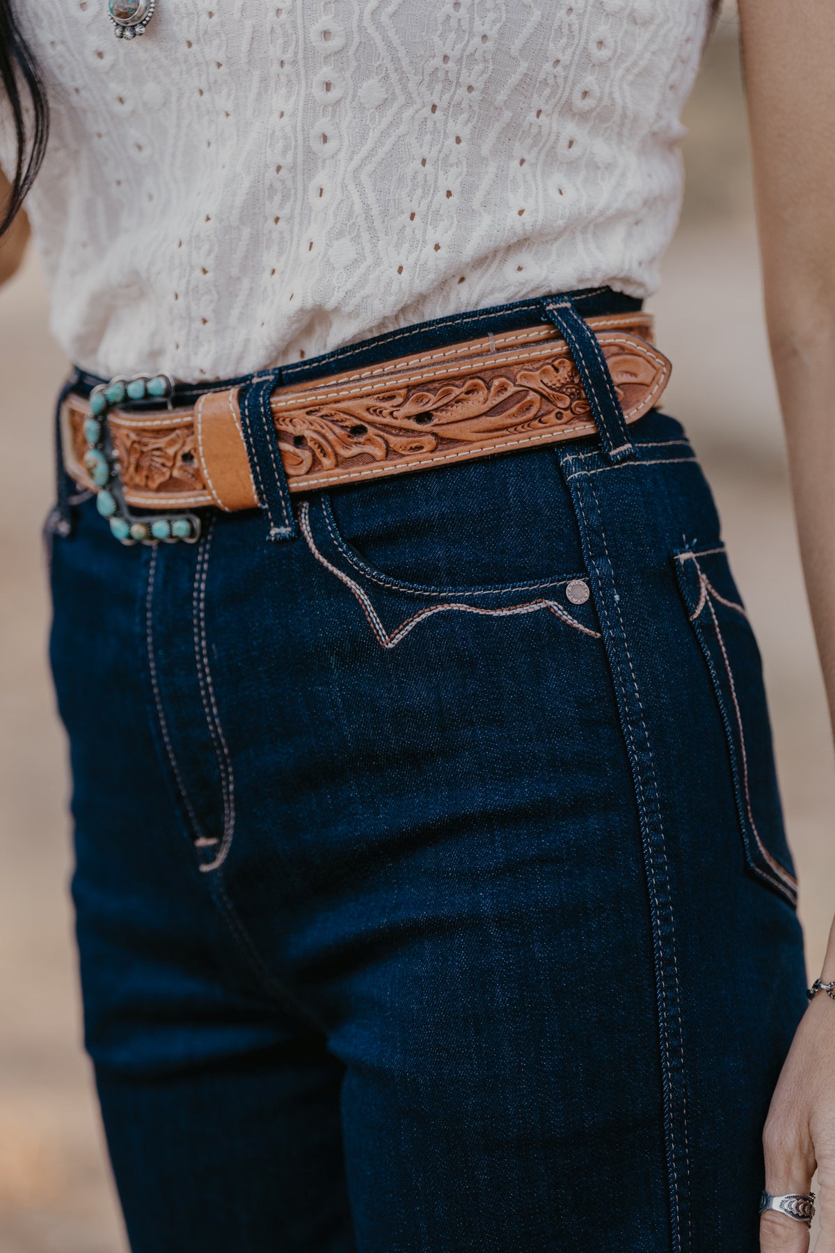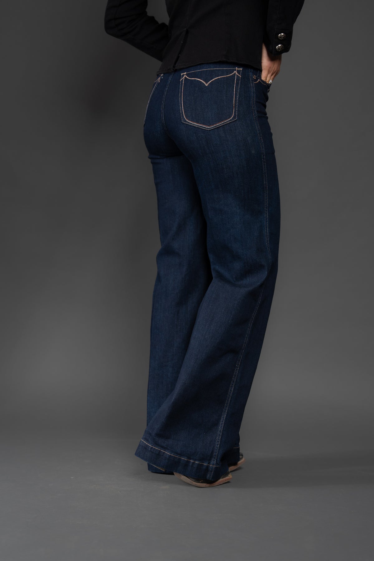 Wide legs, dark rinse, Western details—this jean checks all the trend boxes. Ultra-flattering and incredibly versatile, it shines in the arena and on the town. Delicate stitching adds to its ranch-chic vibe.