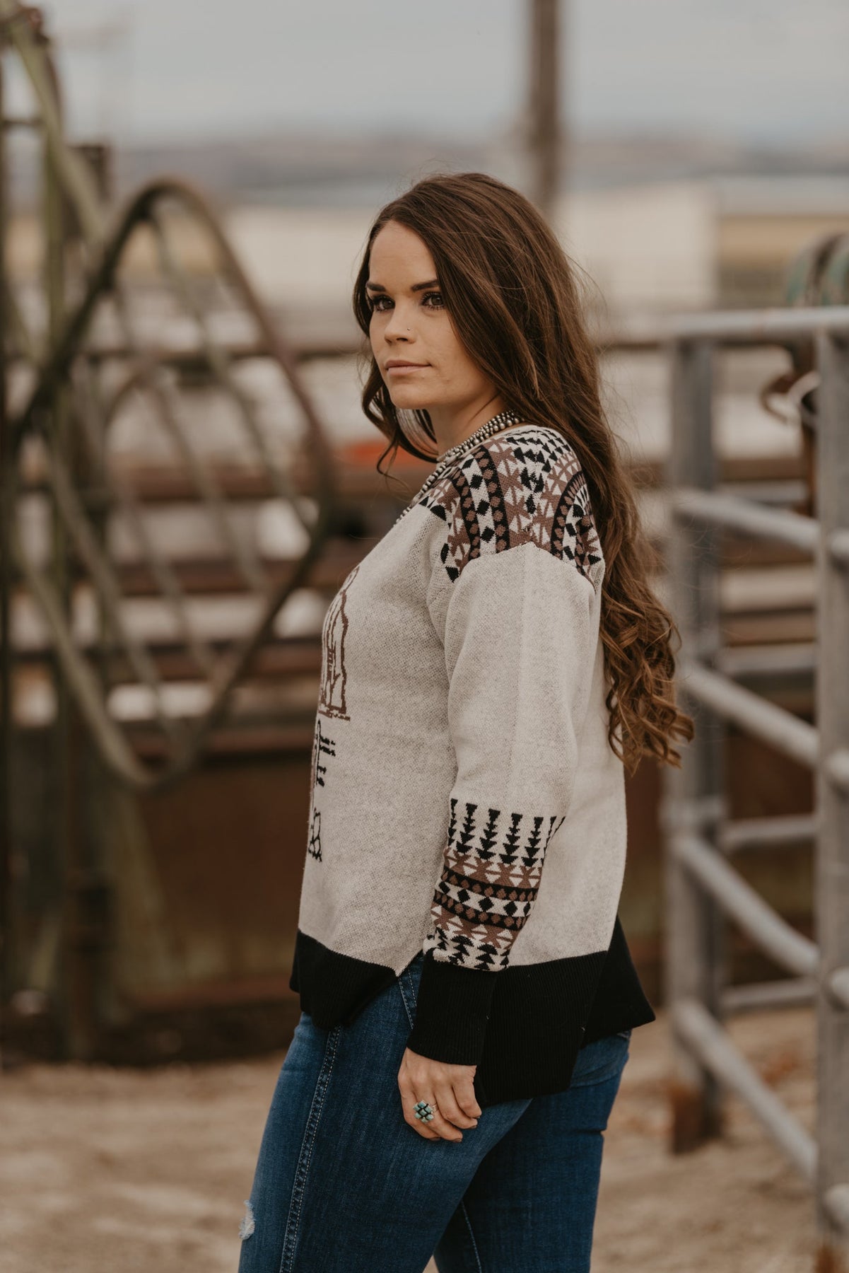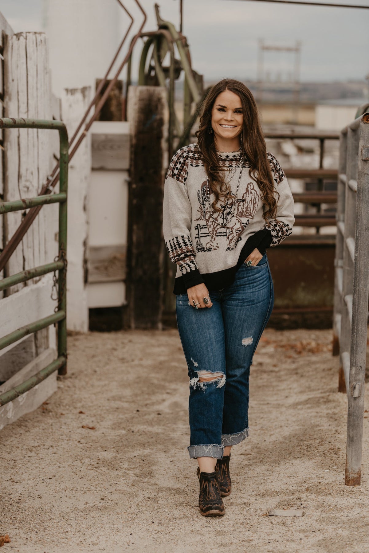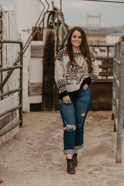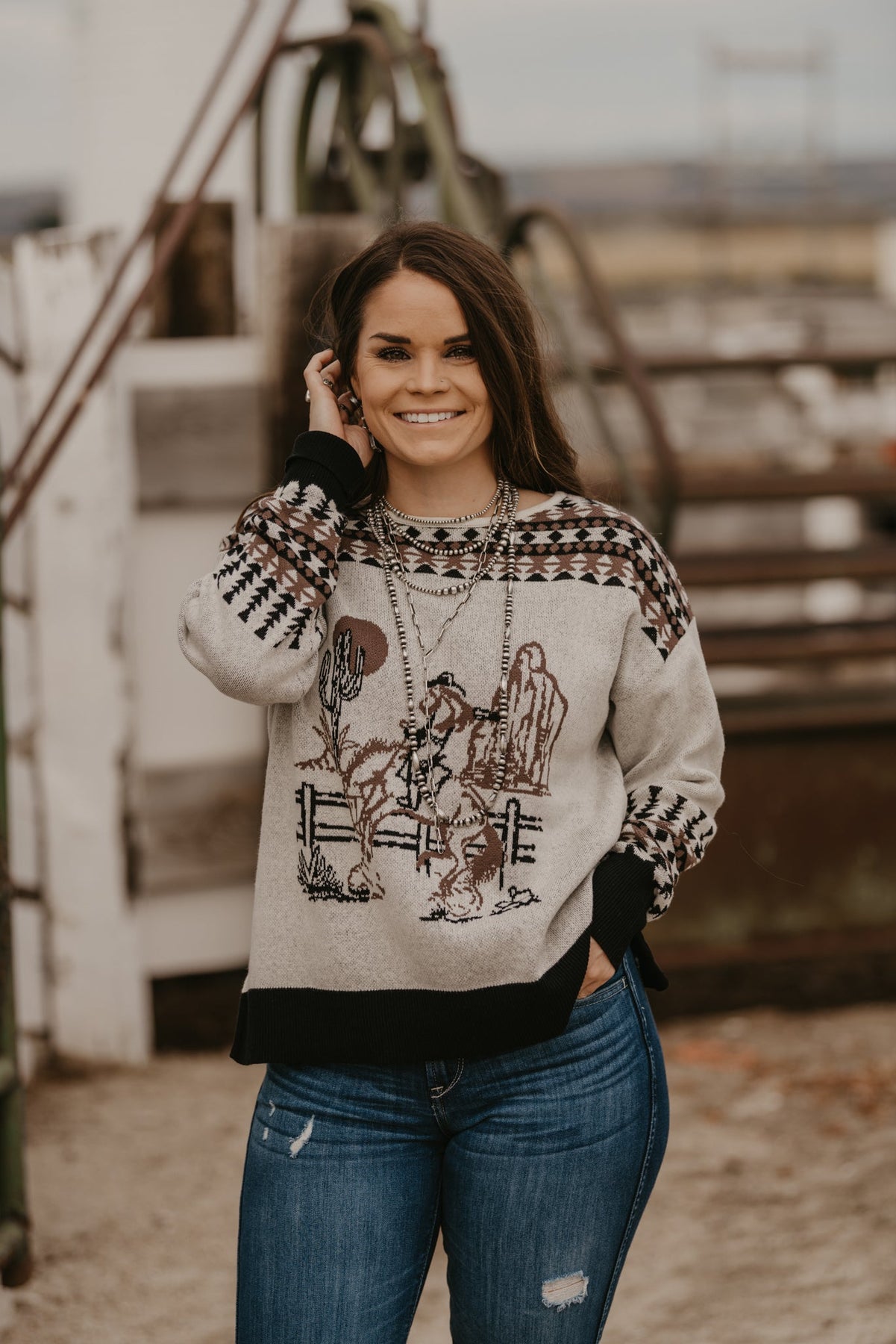 Saddle up cowgirl, we are headed out! Long sleeve sweater with neutral tones and a bronc riding cowgirl.