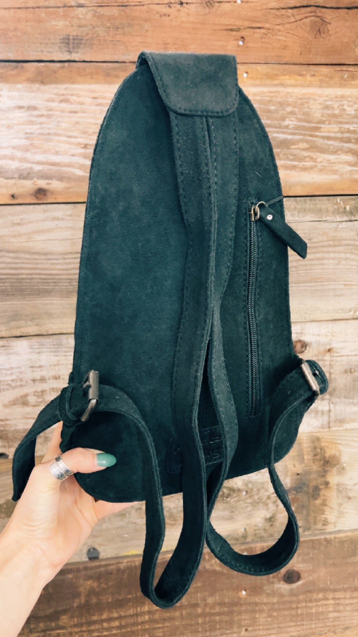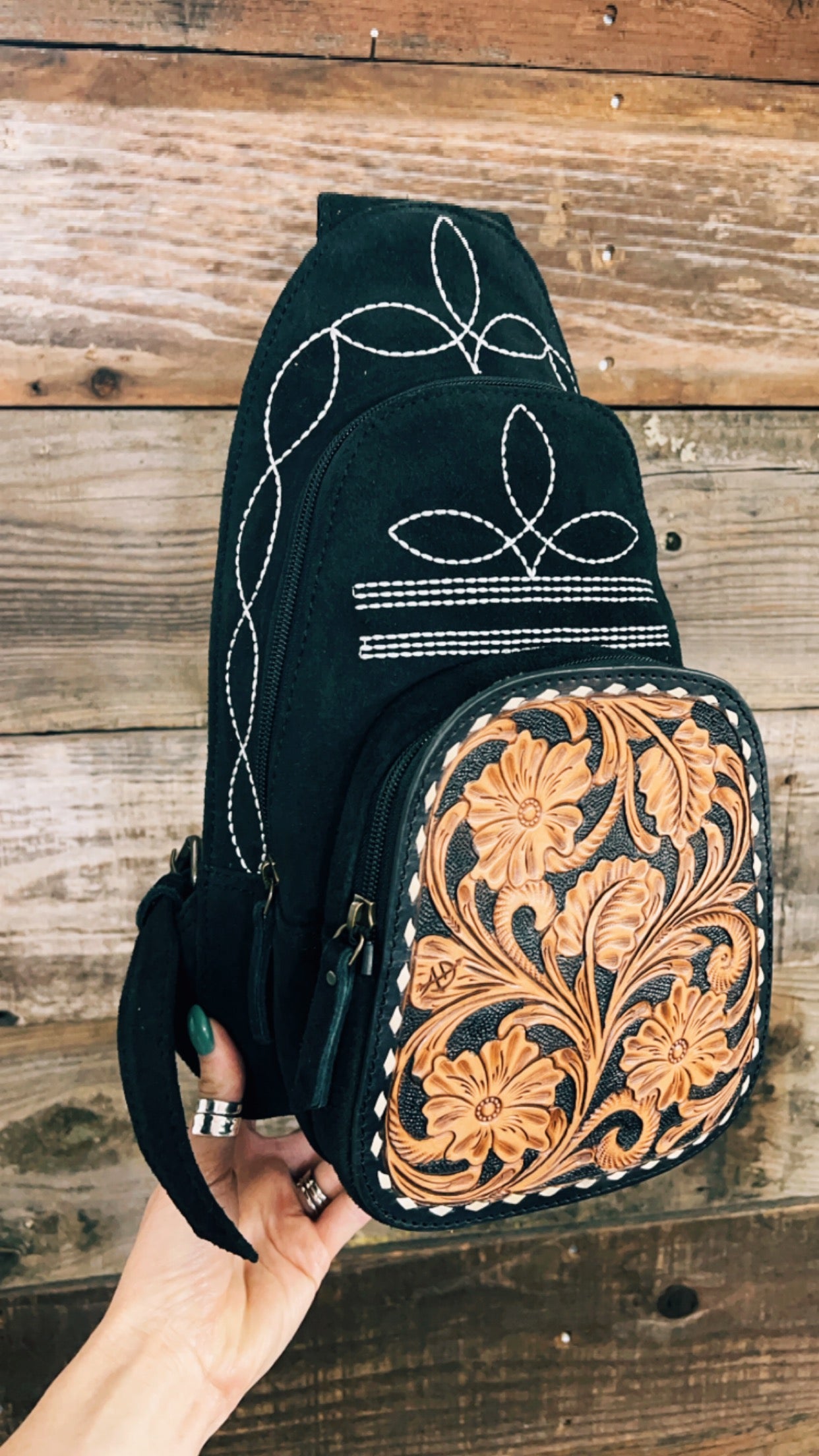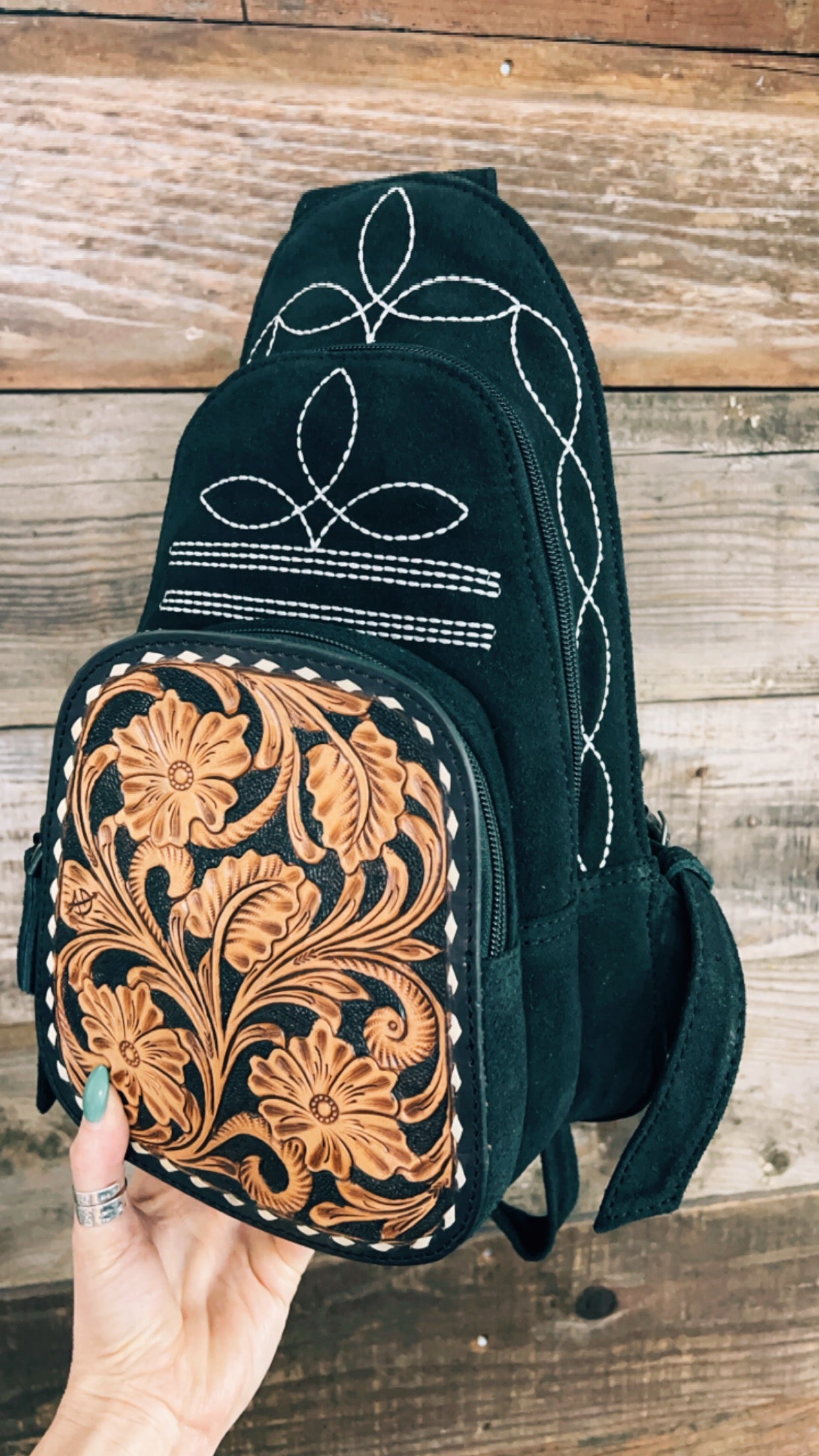 Calling all boot stitch fans....this backpack has got it all for you! SO many gorgeous details in one backpack. Made from a soft suede leather, front leather patch with buckstitch, and embroidered detail. Main pocket has zipper closure, fully lined, inner zipper privacy pocket, front panel pocket with leather patch, and zipper closure. Back zipper privacy pocket/concealed weapons carrier.Backpack style straps that are adjustable.